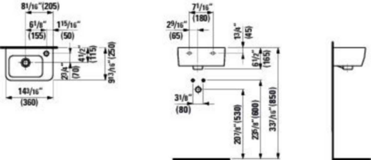 Pesuallas Pro 36 x 25 x 16,5 cm. Hanareikä oikealla, kokonaan lasitettu ylivuoto. Valkoinen saniteettiposliini EN 31.