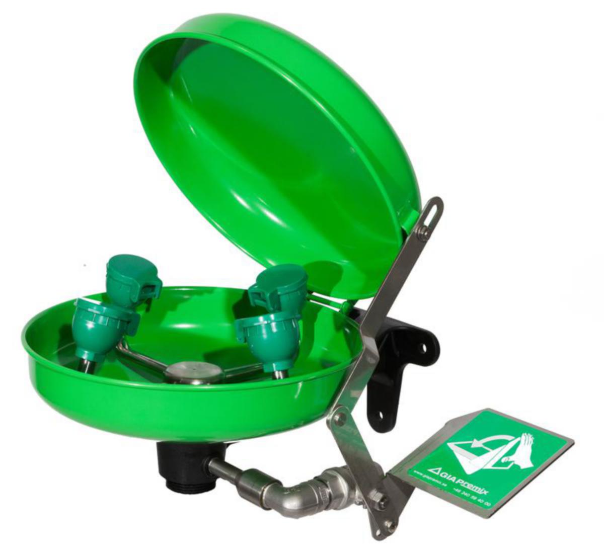 Silmä– ja kasvosuihku neljällä suuttimella, puuterimaalatulla kannellisella kulholla, seinä-asennus. Haponkestävästä materiaalista.