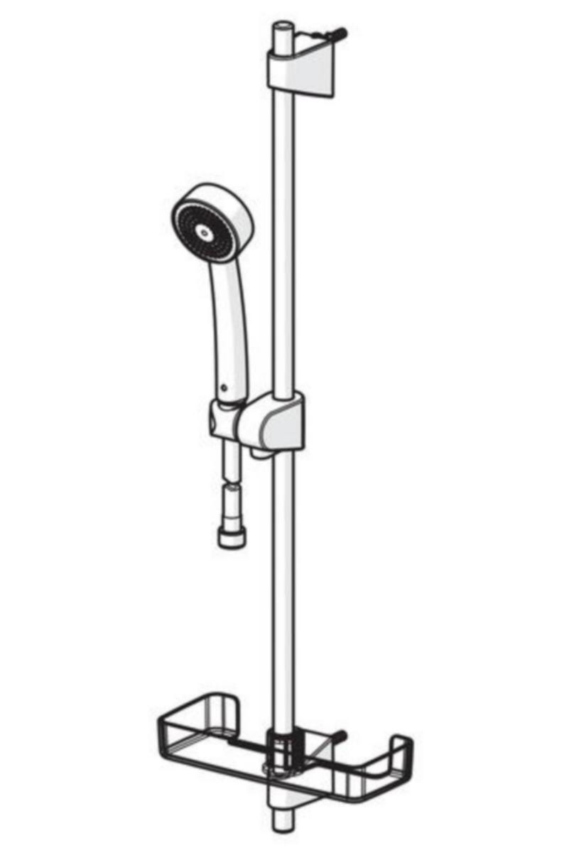 Säädettävä suihkutanko, käsisuihku (jossa helposti puhdistettava, kalkkivapaa siivilä), suihkuletku (1500 mm) ja saippuateline.