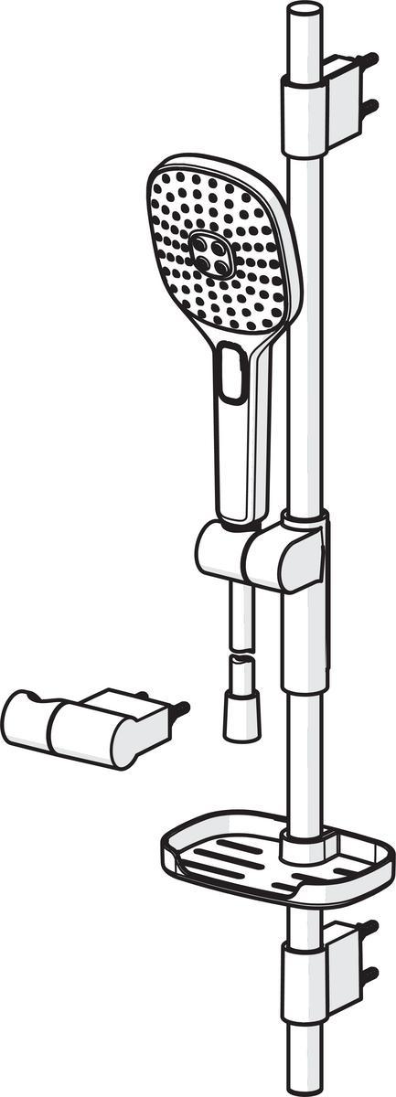 Oras Hydractiva Style -suihkusetti, joka sisältää käsisuihkun, säädettävän suihkutangon (max. 740 mm), saippuatelineen, seinäkiinnikkeen ja suihkuletkun (1,75 m). Käsisuihkussa helposti puhdistettava, valkoinen siivilä (110 x 120 mm) ja kolme säätövaihtoehtoa: Sensitive (laaja ja hellävarainen), Intense (voimakas) ja Pulse (hierova).