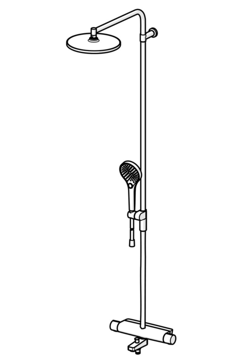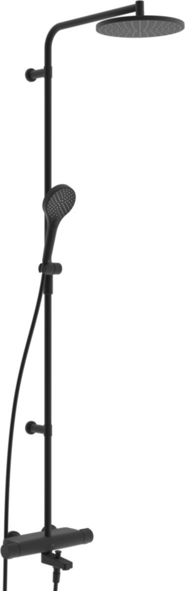 Termostaattinen sadesuihkuhana jossa juoksuputki, sadesuihku ja käsisuihku. Hanassa on EcoFlow-virtaamasäädin ja lämmönsäädin. Kahvassa helppokäyttöinen vaihdin juoksuputkelle/kattosuihkulle ja juoksuputkessa nostettava vaihdin käsisuihkulle. Lämmönsäätökahvassa on lämpötilanrajoitin, joka voidaan ohittaa nappia painamalla. Irrotettava säilytystila suihkutarvikkeille. Käsisuihkussa kolme säätövaihtoehtoa, helposti puhdistettava siivilä, suihkupidike sekä seinäkiinnike. Suihkuletku (1750 mm) pyörii liittimestään estäen letkun kiertymisen. Hanassa on roskasiivilät ja yksisuuntaventtiilit. Mattamusta.