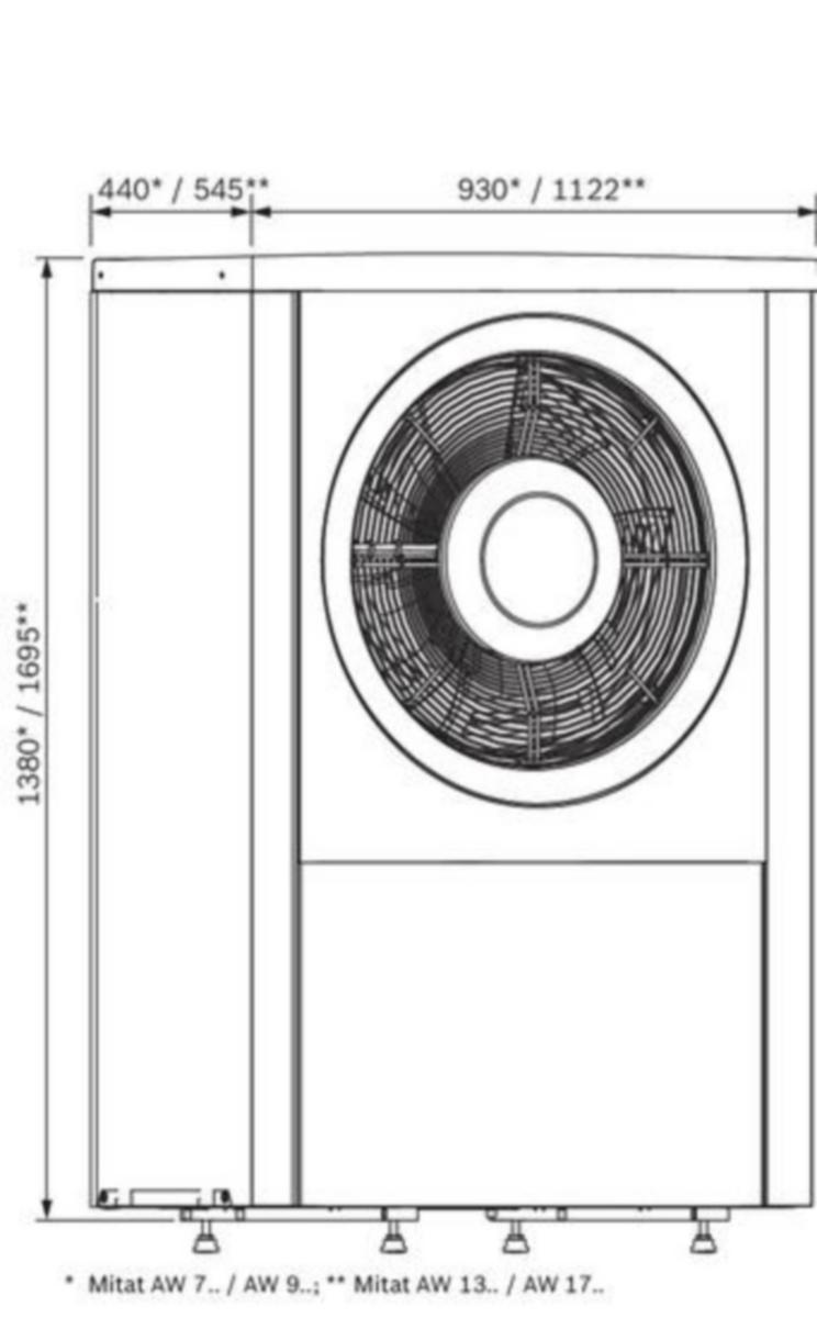 Bosch Compress 7000iAW on innovatiivinen inverter -kompressorilla varustettu ilma-vesilämpöpumpun ulkoyksikkö. Mallisarja on ns. monoblock tyyppinen, eli lämmitysvesi kiertää ulko- ja sisäyksikön välillä. AW- mallisarjasta löytyy viisi eri teholuokkaa 5, 7, 9kW (1-vaihe) sekä 13 ja 17kW (3-vaihe).