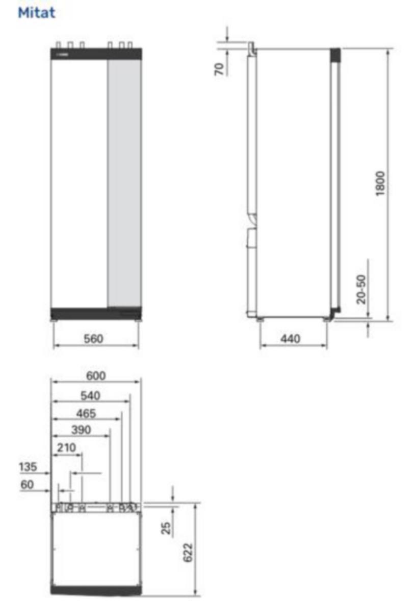 NIBE S-sarjassa on sisäänrakennettu wifi ja siitä tulee myUplink-palvelun avulla luonnollinen osa internetiin liitettyä kotiasi. Fiksu ohjaus säätää automaattisesti lämmöntuotantoa ulkolämpötilan mukaan ja voi myUplink-palvelun avulla huomioida myös sääennusteen. Fiksujen langattomien lisävarusteiden avulla järjestelmä lisäksi huomioi sisäilman eri arvoja. Voit valvoa ja halutessasi ohjata* järjestelmää älypuhelimella tai tabletilla. Sisäyksikkö VVM S320 on 180 cm korkea, 60 cm leveä ja 62 cm syvä. Katso tarkat tekniset tiedot esitteestä.