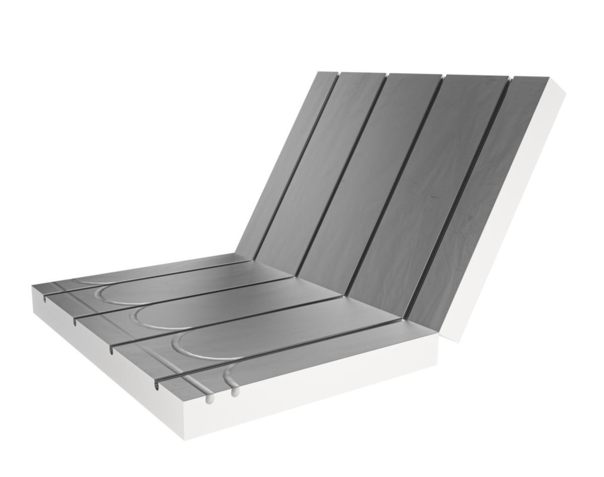LK CombiBoard EPS 70. Alumiinifoliolla pinnoitettu EPS-levy. Paksuus 70 mm, 16 mm putkelle, asennusväli k/k 200 mm (4 uraa).
