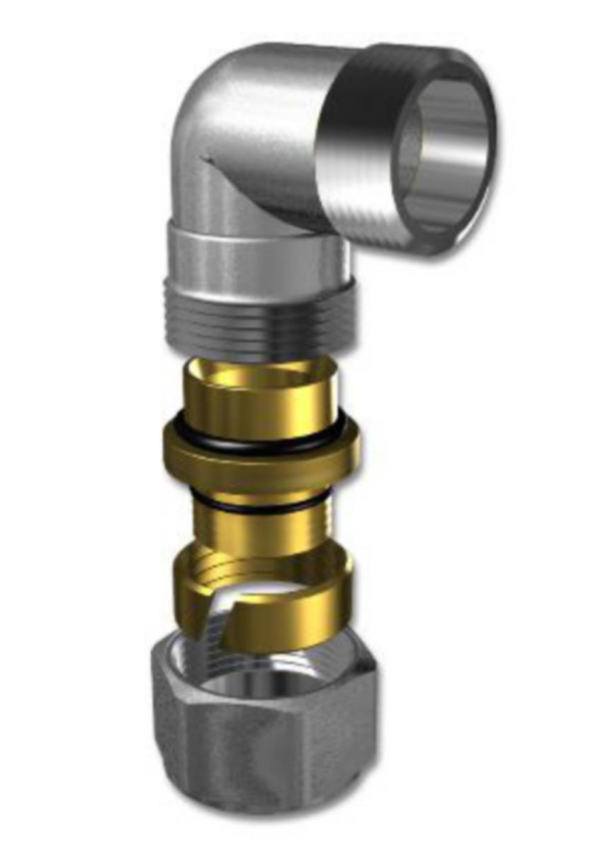 Kulmaliitin ulkokierteellä PE/PE-X –putken liittämiseen.