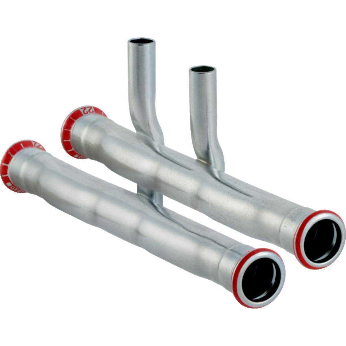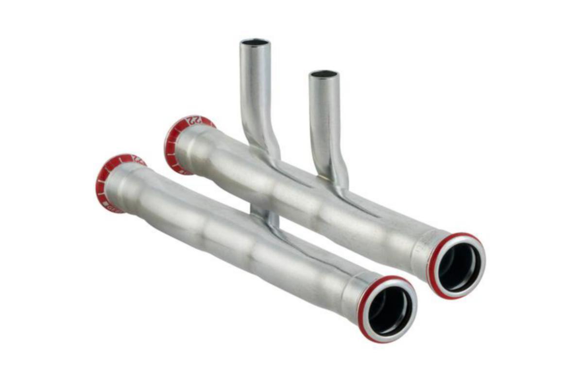 Ominaisuudet: Puristuksen ilmaisin, puristamattomana vuotava liitos, meno ja paluu vaihdettavissa. Ulkopuoli sinkitty, O-rengas mustaa CIIR-kumia, muhvipäissä läpikuultava suojatulppa. Materiaali Seostamaton teräs 1.0034 E195 (EN 10305). Toimituksen sisältö: T-haara, jossa lyhyt kytkentähaara T-haara, jossa pitkä kytkentähaara.