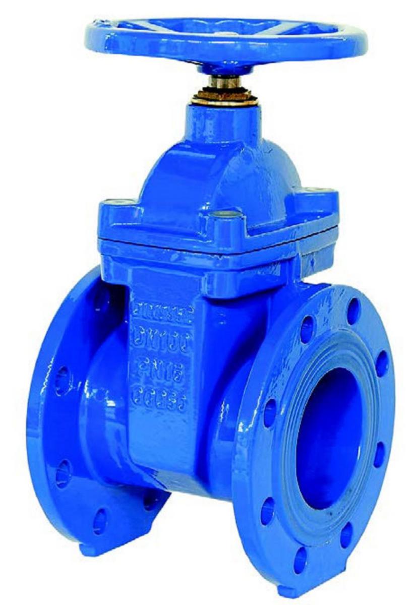 Soft sealing gate valve with straight free passage and non-rising stainless steel spindle. RAL 5010 Epoxy-painted internally/externally.
