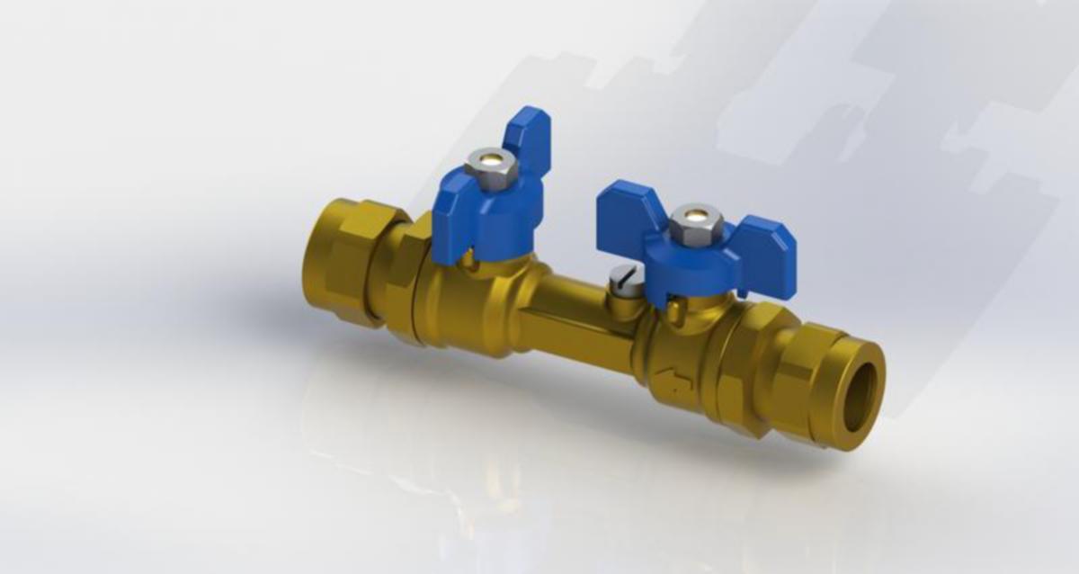 Niin sanottu ryhmäventtiili, jossa on kaksi kappaletta pallosulkuja, sekä takaisku tarkastusruuvilla.