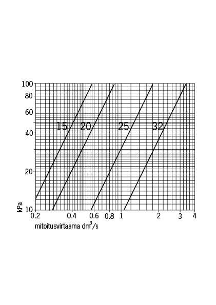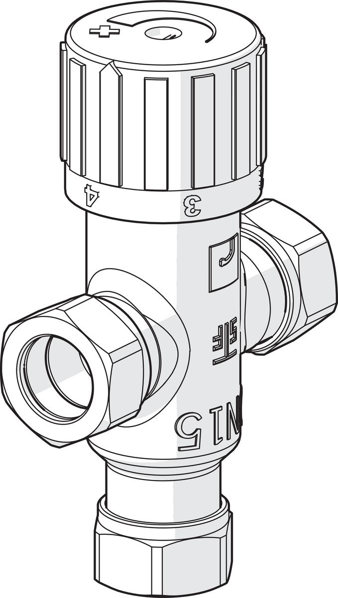 Omavoimainen 3-tiesekoitusventtiili. Rakennepaine 1 MPa (10 bar). Raaka-aine erikoismessinki, sinkkikadonkestävä. Kumitiivisteet EPDM. Säätöalue +37°C...+65°C.