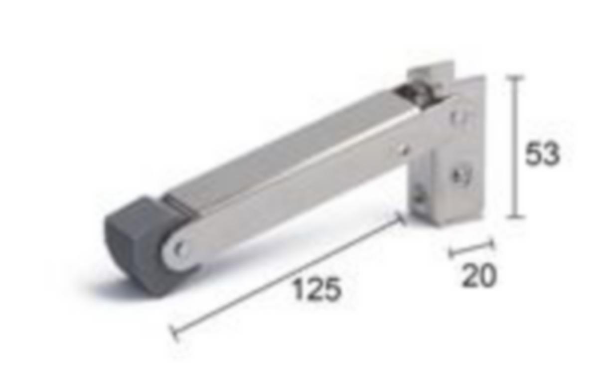 Nikkelöity tai valkoiseksi maalattu rauta. Kumivaimennin. Taitettava malli. Kokonaispituus 145 mm. Kiinnityslevy 20 x 50 mm.