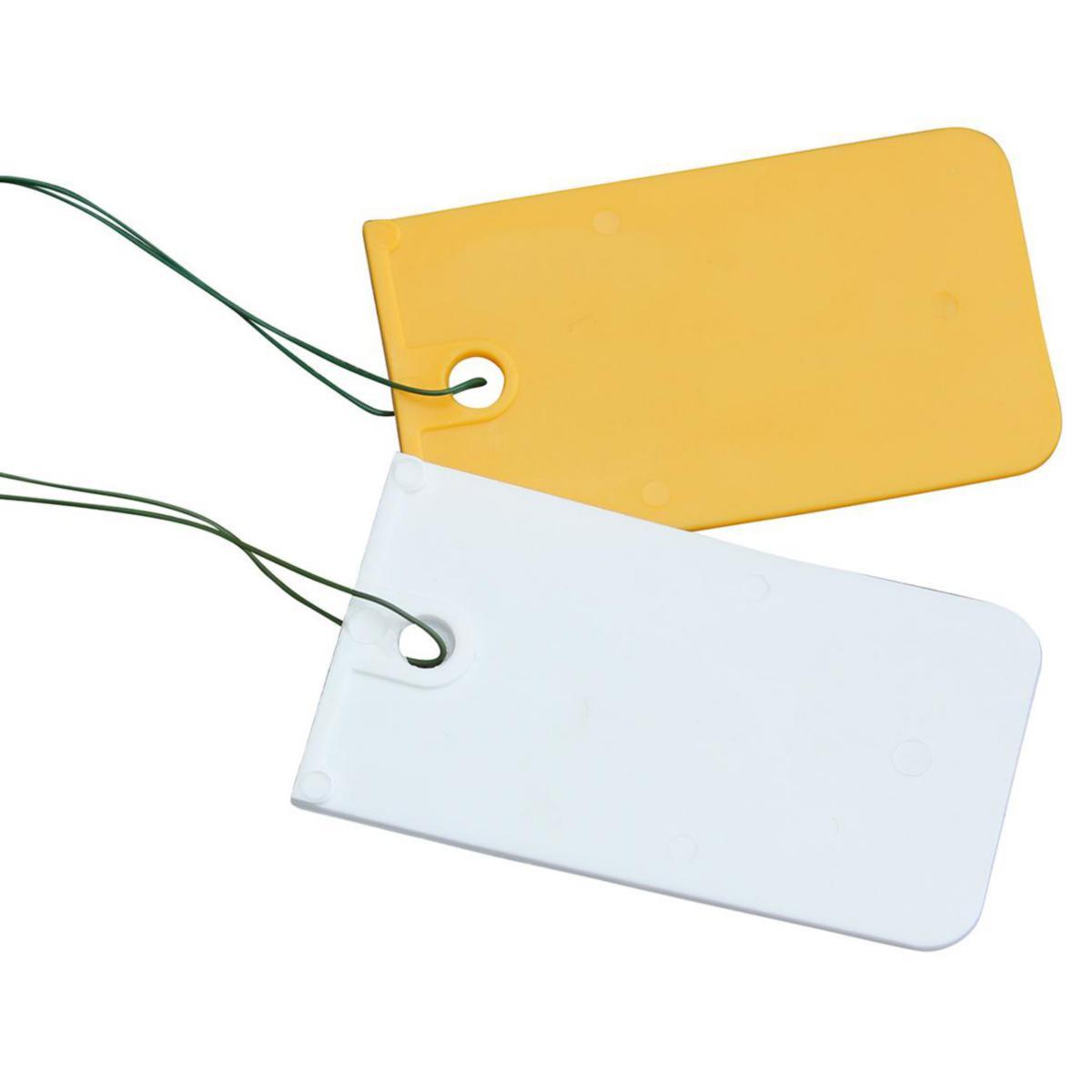With iron wire. Tag in plastic, available for order even in sizes 60x100mm and 70x120mm)