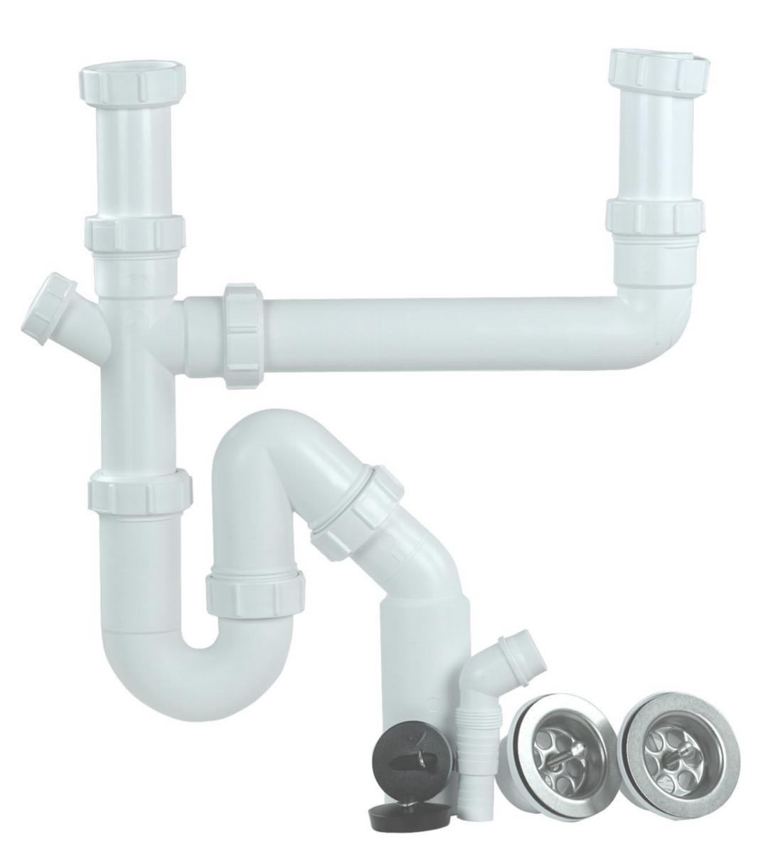 2-osainen vesilukko, kahdella pohjaventtiilillä. Täydellinen setti, sis. putket, pohjaventtiili, kumitulppa, tiiviste- ja kiristysrenkaat. Viemäriliitos, halkaisija 50 mm.
