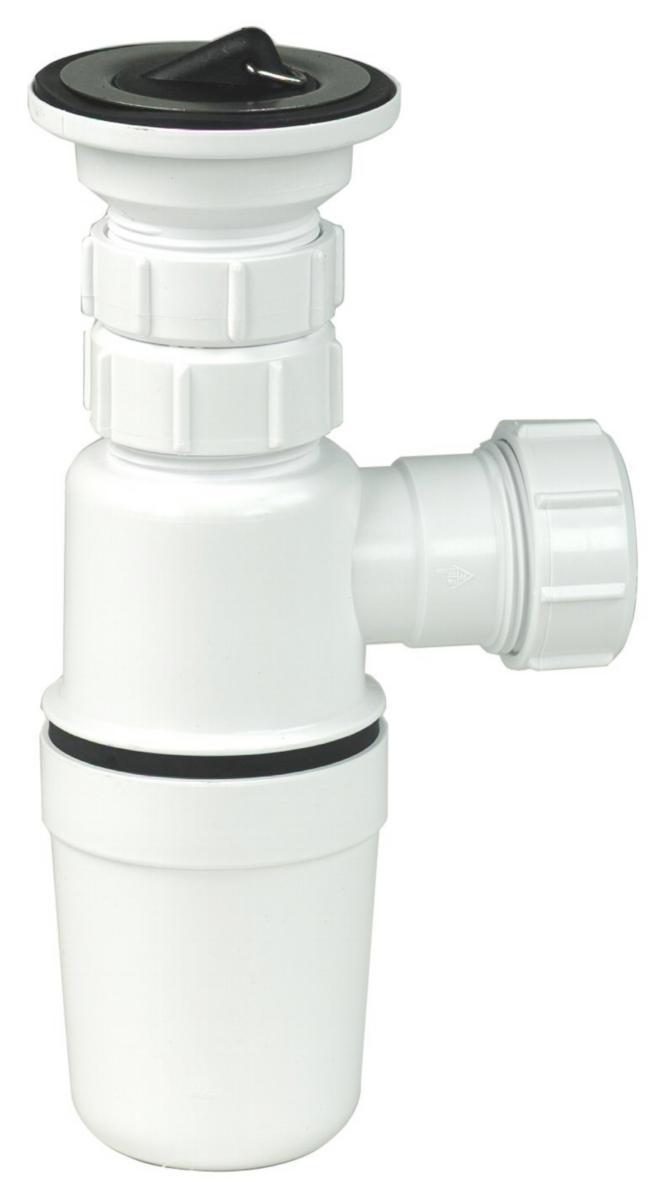 8.Aseta poistoputki/kulmaputki (mikäli kuuluu mukaan toimitukseen) viemäriliitokseen ja paina putki (pullo)vesilukon sisään.