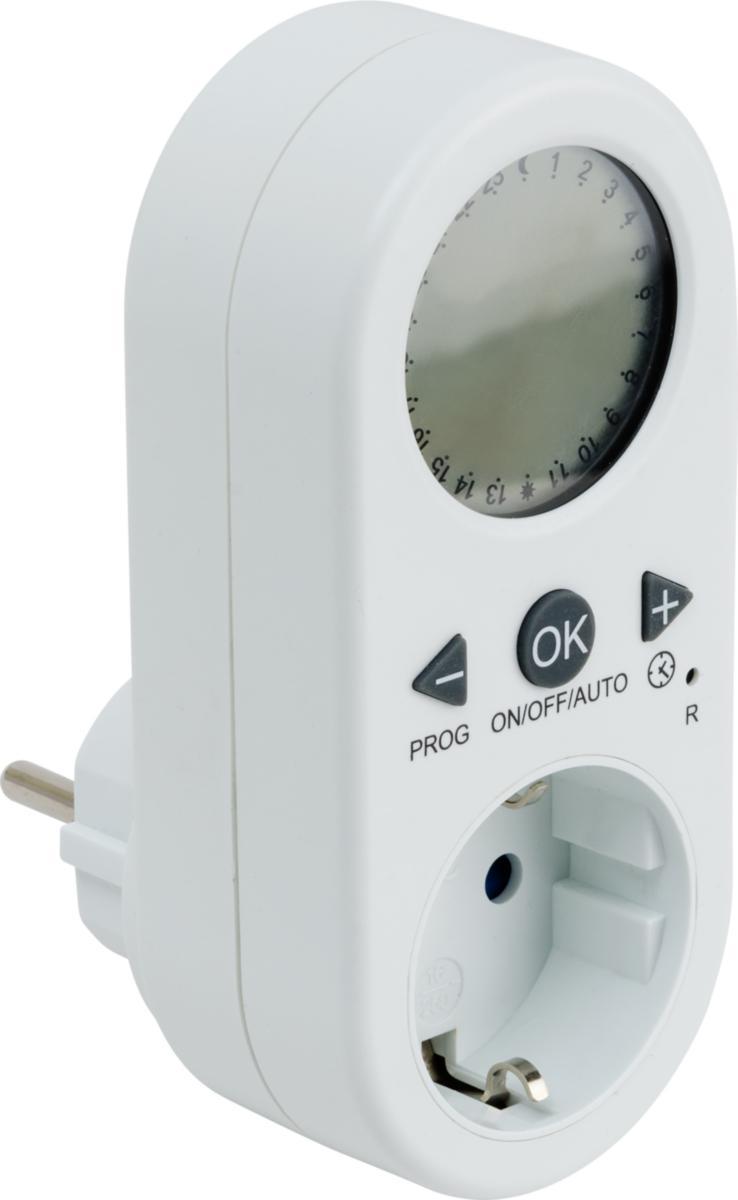 Digitaalinen ajastin kytkee sähkölaitteet päälle ja pois päältä ohjelmoitavalla tavalla. Suuri pyöreä LCD-näyttö näyttää valitun ohjelman ja näyttää kellonajan suurilla digitaalisilla numeroilla. 30 min ajastusväli, 48 ON/OFF per päivä. Max 1800 W kuorma. Vain sisäkäyttöön kuivissa tiloissa, kotelointiluokka IP20.