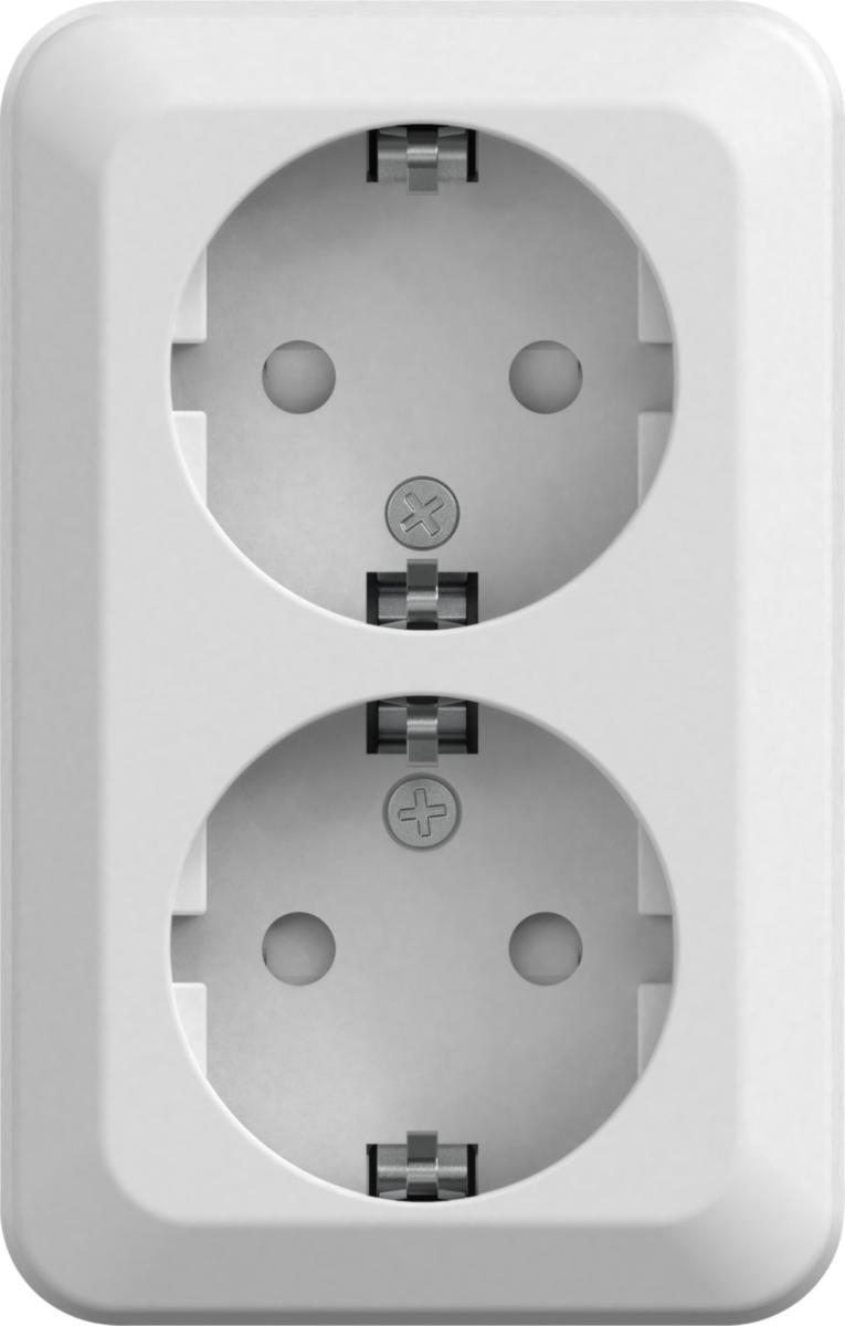 Pinta-asennettavassa pistorasiassa on kosketussuoja. Kaksi liitäntäpaikkaa ruuviliitosta kohti. Pohjalevyssä on valmiit reikäpaikat sisääntulolle 16 mm putkille. Maadoitettu.