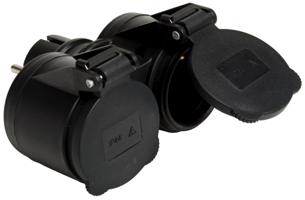 2-osainen haaroitin itsesulkeutuvilla kansilla. Syvät kuopat ja kumitiiviste. Sopii erinomaisesti suorille pistotulpille, ei sovi yhteen taivutetun pistokkeen tai verkkosovittimen kanssa. 16A/250V. Kotelointiluokka IP44. Maadoitettu.