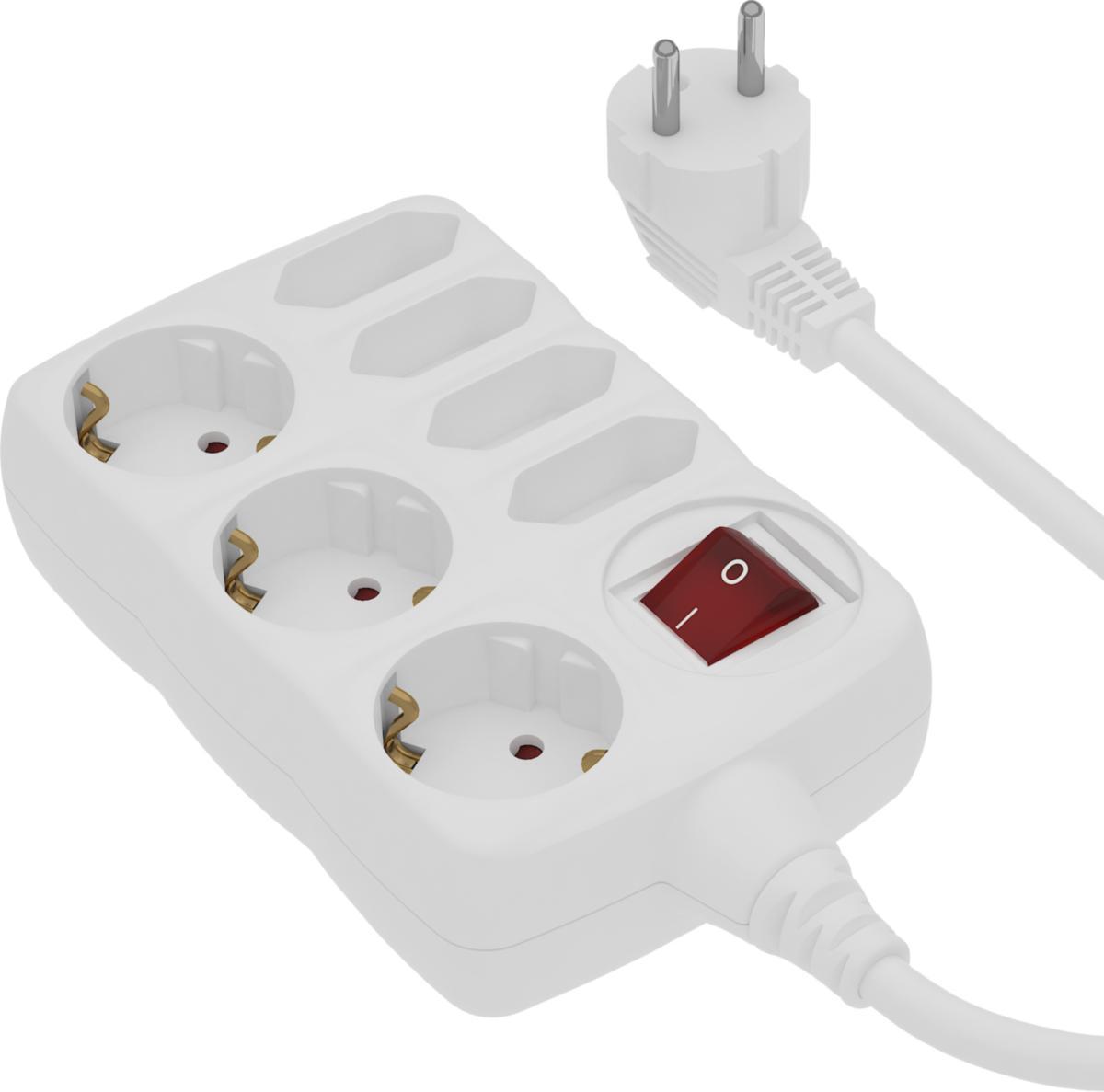 Jatkojohto yhdistelmähaaroitinosalla, jossa kulmassa olevat maadoitetut pistorasiat ja pistorasiapaikat eurooppalaisille litteille pistokkeille. 2-napaisella kytkimellä.