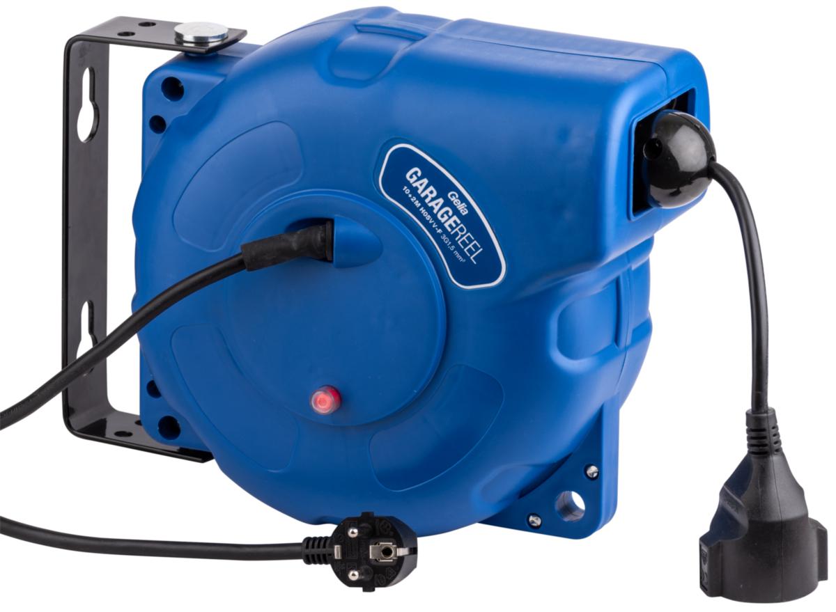 Kaapelikela seinäasennukseen jatkojohdolla, maadoitetulla pistokkeella ja maadoitetulla pistorasialla. Koukkuun ripustettava tai seinälle asennettu kaapelikela on täydellinen autotalliin tai muuhun sisällä olevaan tilaan.