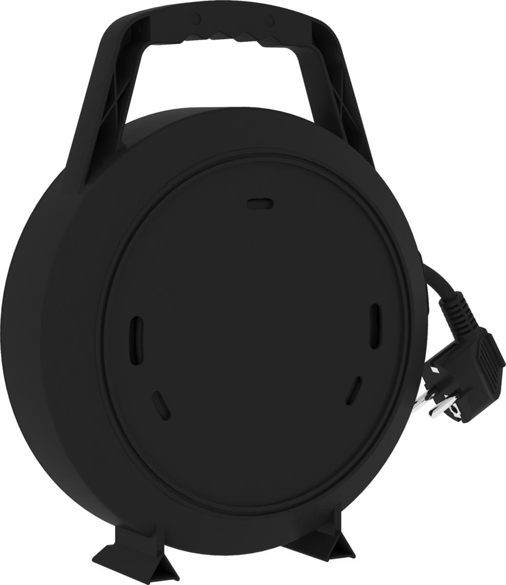Itseseisova 4-osainen kaapelikela pienitehoisille sähkölaitteille sisäkäyttöön. Kaapelikelassa on ergonominen kantokahvalla ja tukeva muovirunko.