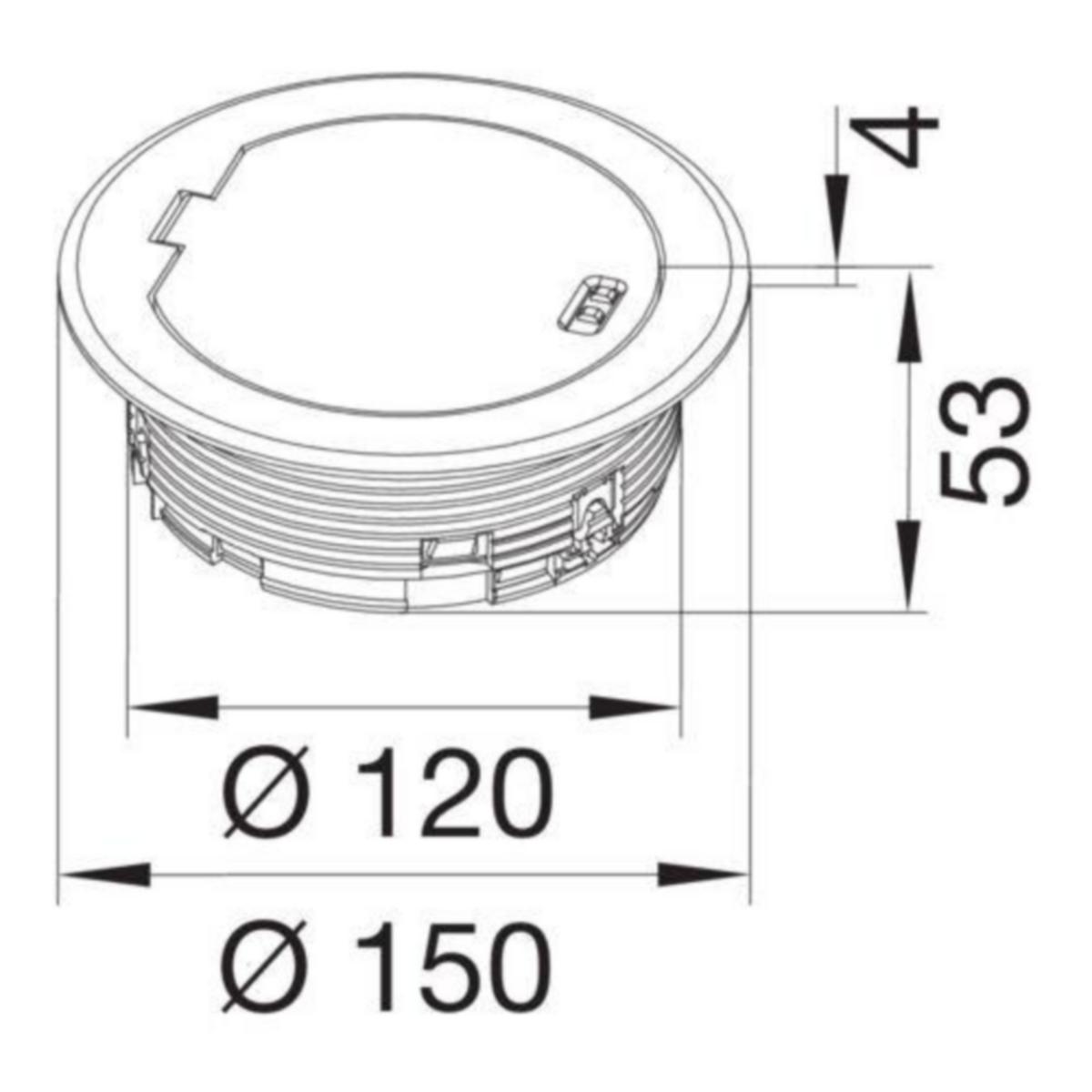 Kaapeliläpivientirengas metallista saranakannella. Asennus kiinnityskynsin minimissään 32 mm paksuihin korotettuihin tekniikkalattioihin. Kiinnitys sitä ohuempiin lattiapintoihin erikseen tilatavan kiristysrenkaan BSR02R kanssa. Soveltuu käytettäväksi kuiva- ja kosteapestäviin lattiapintoihin. Asennuskehys asennusaukkoa peittävä, asennusaukko d = 112 mm, ulkohalkaisija 150 mm.