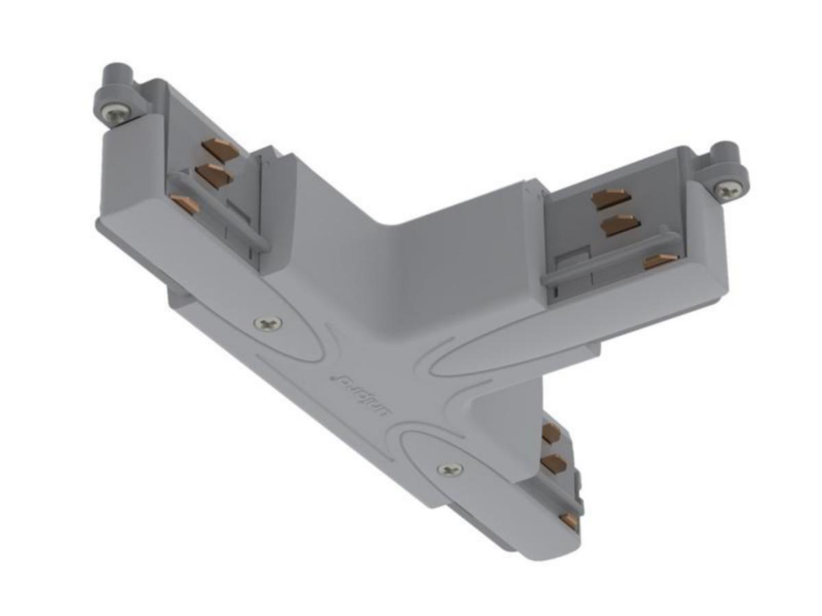 Valkoinen T-kappale nopeisiin kosketinkiskojen jatkoihin ja yhdistämisiin. T-kappaleessa on sähkönsyöttömahdollisuus, maadoitus A.