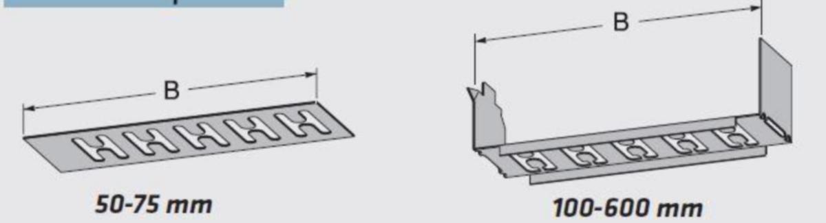 Nippusidetuki/erotuslevyn tukiTarkoitettu kaapelien tai erotuslevyn nippusidekiinnitykseen. Tuki napsautetaan kiinni levyhyllyyn. Kanavaleveyksiä on saatavissa 25 mm:n portaissa.