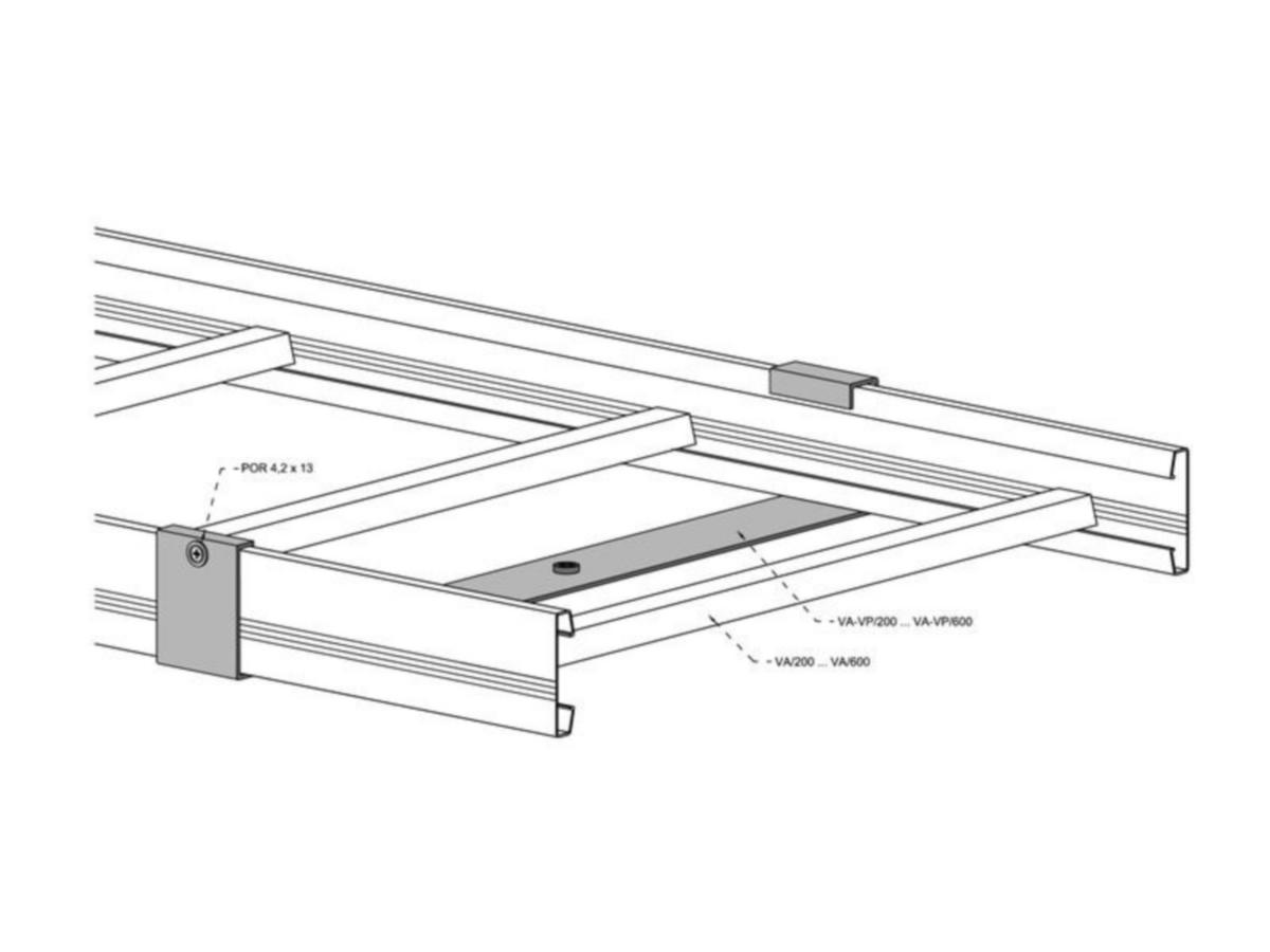 VA-VP/200-600 valaisinkiinnitintä käytetään valaisimen kiinnittämiseen tikashyllyn alapuolelle kun valaisin halutaan tikashyllyn keskelle. Valaisinkiinnitin lukitaan tarvittaessa tikashyllyyn käyttäen porakärkiruuvia (esim. Por/4,2x13mm S1472459).