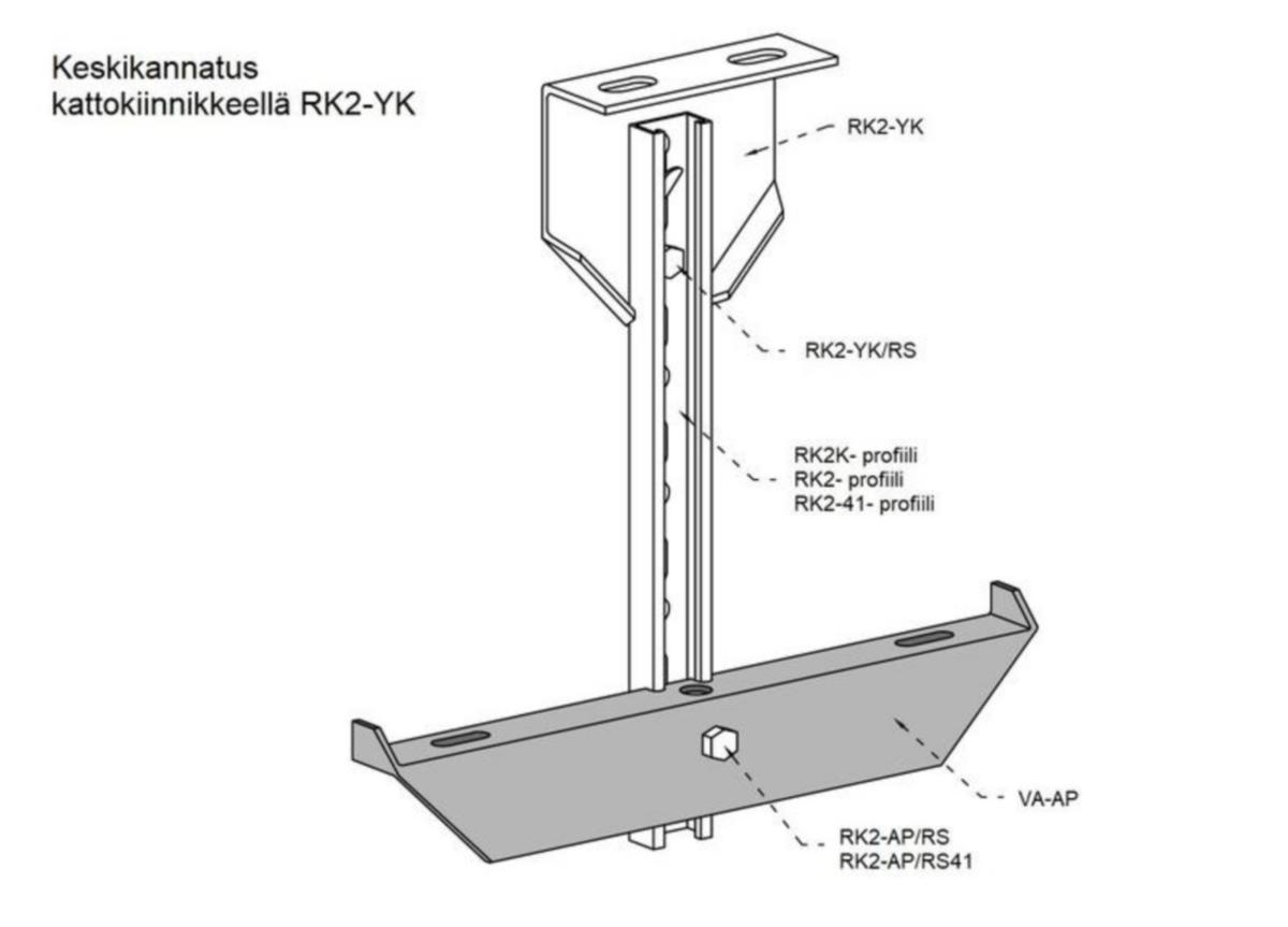 VA-AP/200-600 keskikannakkeita käytetään tikashyllyn katosta ripustamiseen asennettaessa hylly vaakatasoon. Tikashyllyt lukitaan keskikannakkeeseen lukituskiinnikkeillä VA-KI S1472175. Ripustimena käytetään yleisimmin kierretankoa (esim. KK-10 S1472422) tai asennuskiskoa RK2K-profiili S1472171.