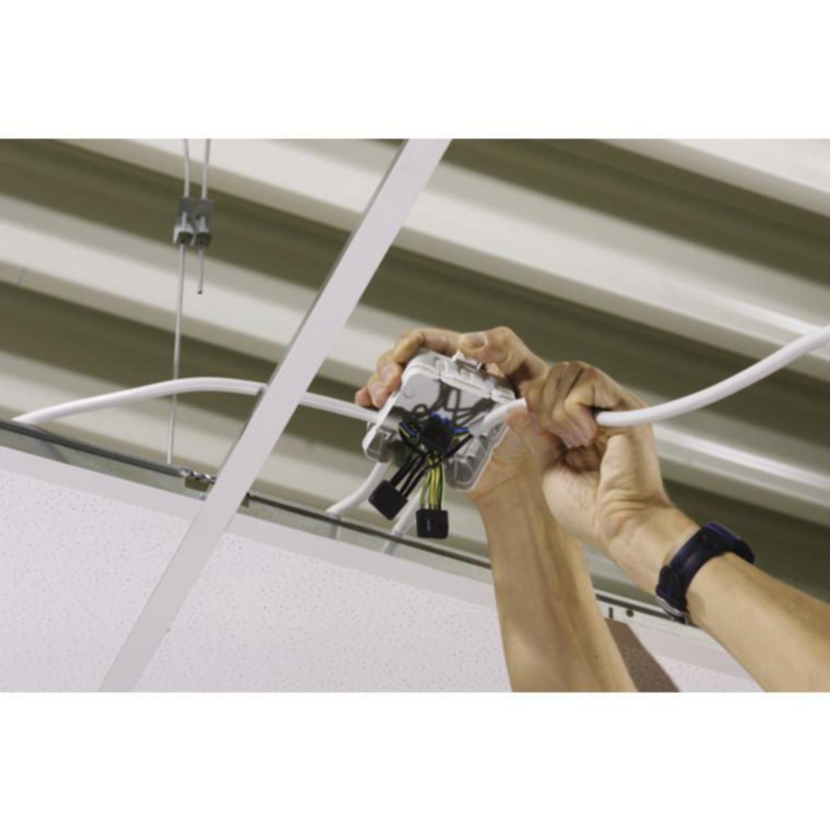 Jakorasia standardin DIN EN 60670 mukainen (VDE 0606), 12 läpivientiä, standardin DIN VDE 0606 mukaisella kaapelipitimellä, NYM(MMJ) 5 x 2,5mm², niistä 7:ään voidaan kaapeli painaa paikoilleen kytkettynä, kolme läpivientiä pohjassa, ulkopuoleisilla kiinnityskorvakkeilla