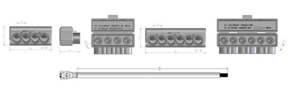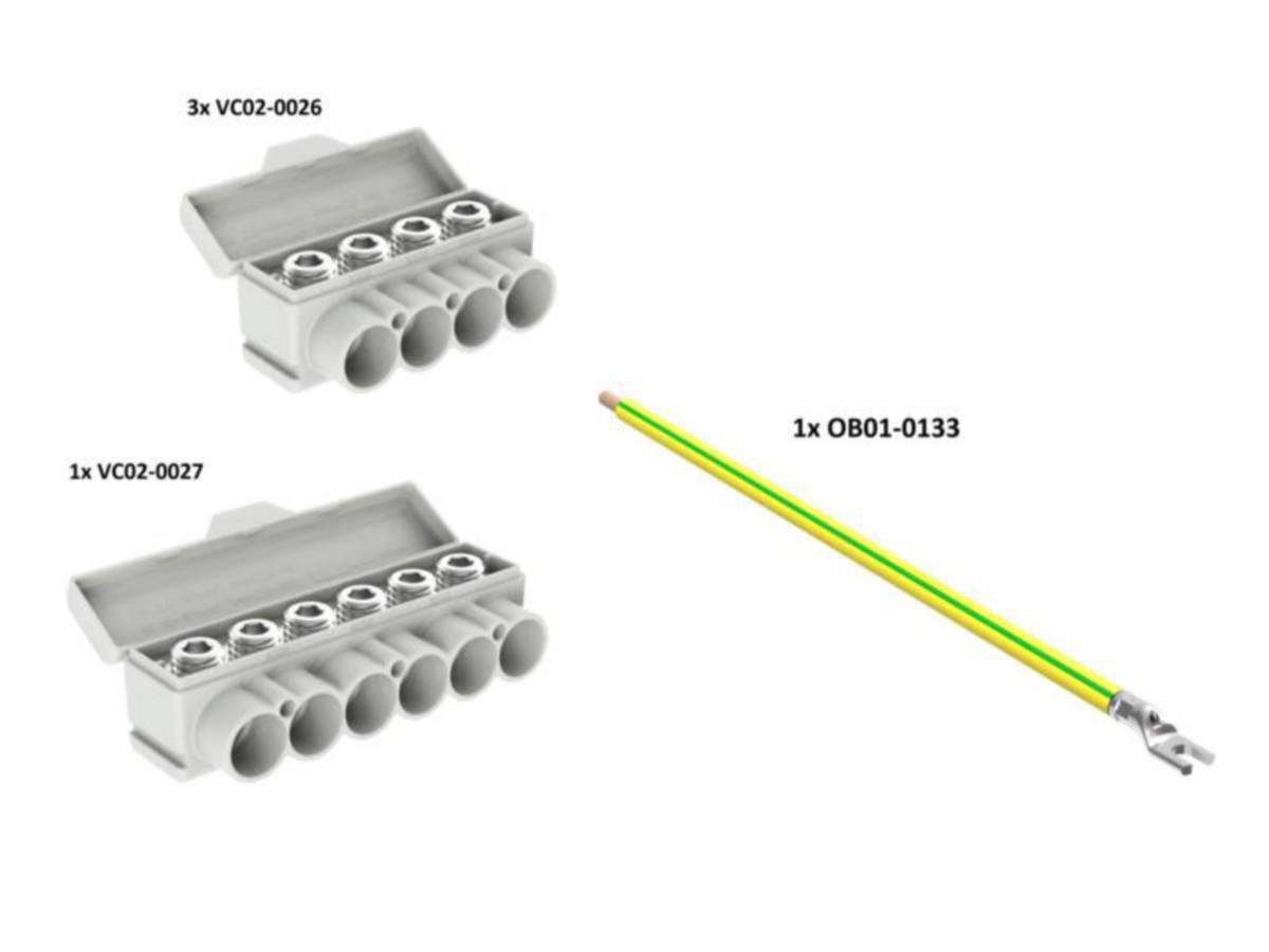 Sarja sisältää 3kpl Al4x50/Cu4x35 liittimiä, 1 kpl Al6x50/Cu6x35 liittimen ja kaapelikengällä varustetun maadoitusjohtimen.
