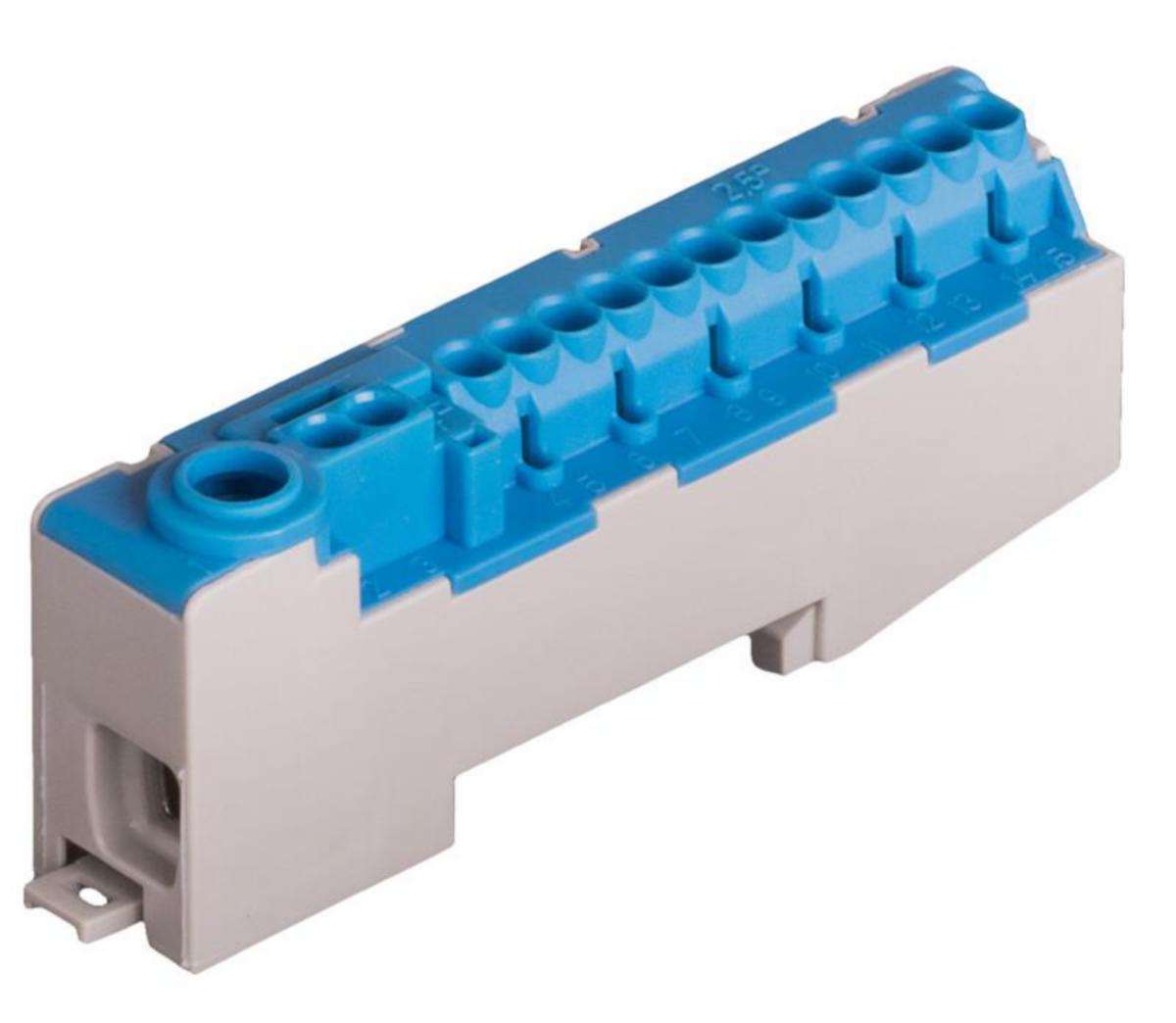 Pollmann kytkentäliitin DIN-kiskokiinnityksellä. Valikoimassamme on omat värit nolla- ja PE-liittimiin.N-/PE-liittimet sopivat:Tulo: 1,5-25mm2 kiinteille johtimille tai 1,5-16mm2 säikeisille johtimille.Lähtö: 2x 1-4mm2 + 12x 1-2,5mm2