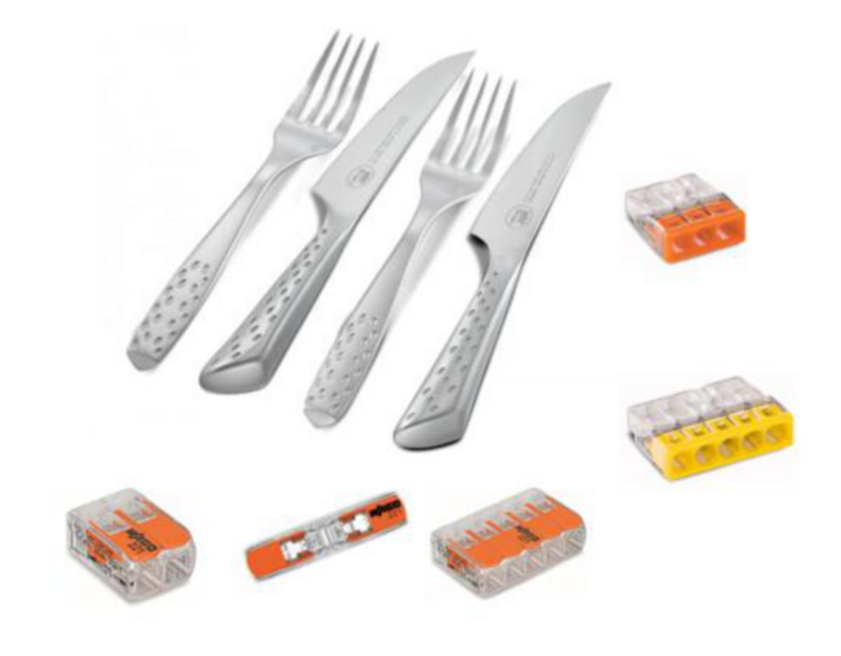 Lajitelmalaatikon sisältö221-412 100 kpl, 221-415 25 kpl, 221-2411 60 kpl, 2273-203 100 kpl, 2273-205 100 kpl ja Weber pihviveitsisarja 4-osainen