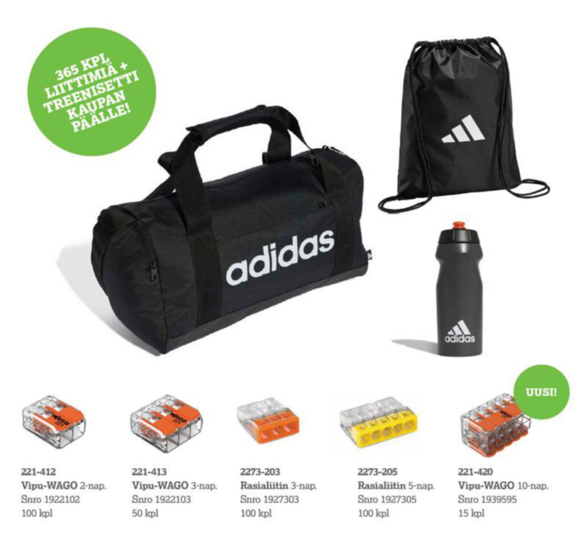 Lajitelmalaatikon sisältö: 221-412 100 kpl, 221-413 50 kpl, 221-420 15 kpl, 2273-203 100 kpl, 2273-205 100 kpl ja Adidaksen treenikassi, juomapullo ja treenipussi.