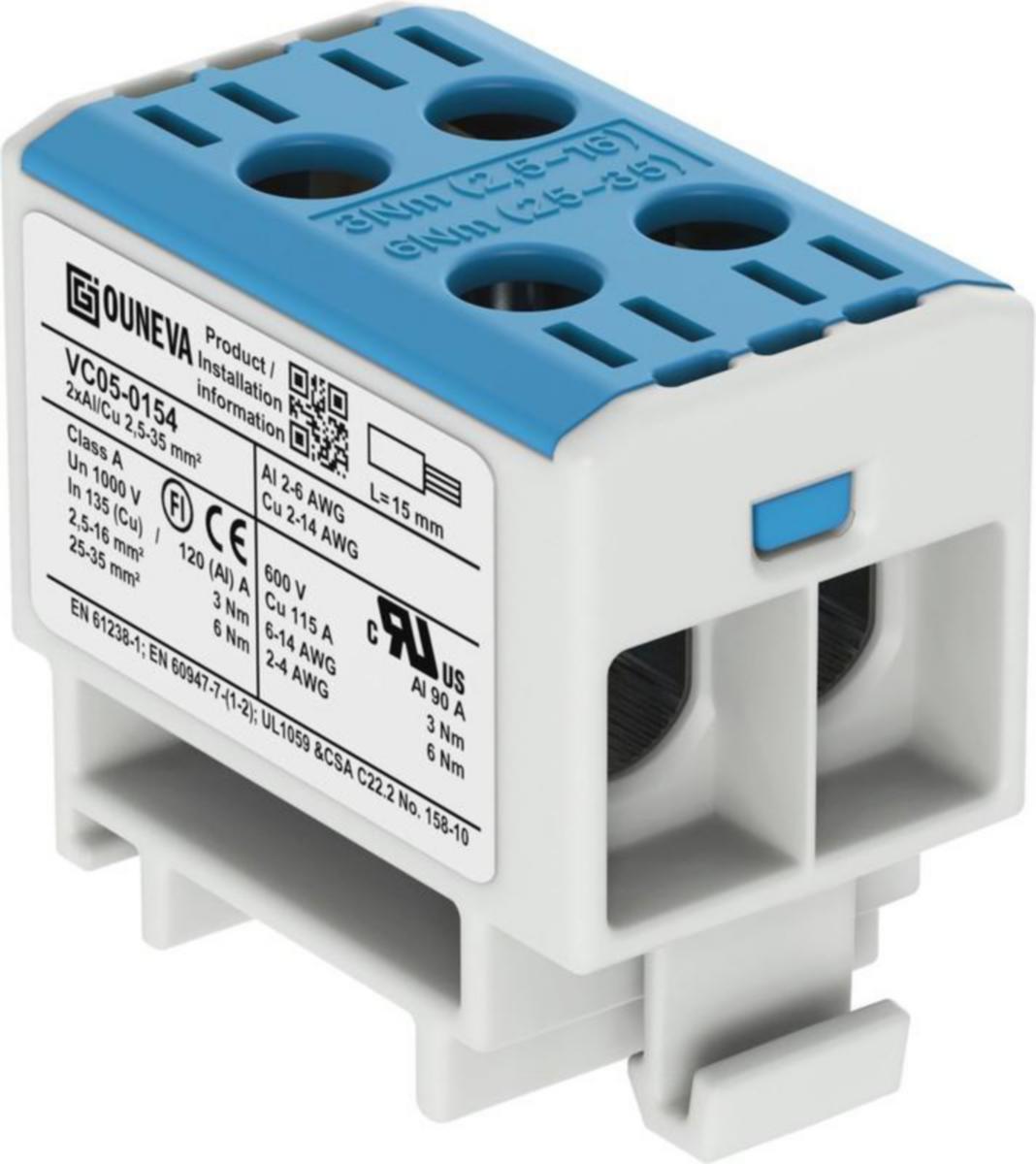 OTL-yleisliitinOTL-yleisliittimet ovat tarkoitettu alumiini- ja kuparikaapeleiden liittämiseen ja haaroittamiseen. Liitinrunko on tinapinnoitettua alumiinia. Kotelointi on valmistettu UL94 V0 -luokan polyamidista.Liittimien nimellisjännite on 1000 V AC / 1500 V DC IEC. Liittimet on UL-sertifioitu 1000 V-jännitteelle. Liittimet valmistetaan Suomessa.Alumiini- ja kupari- (Al/Cu) kaapeleiden liittämiseenAl/Cu 2,5 - 35 mm2