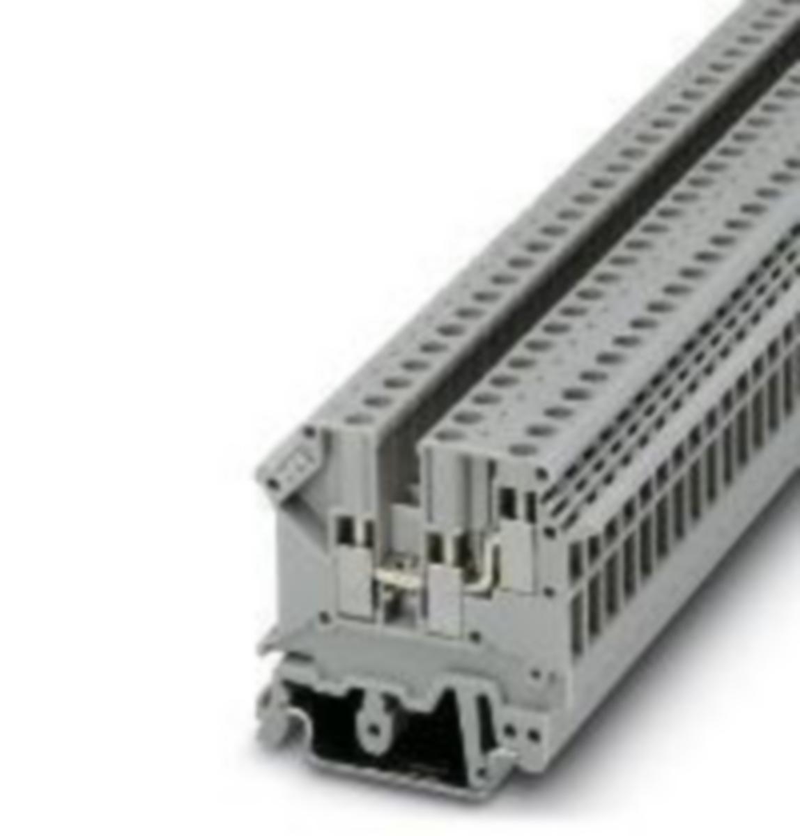 1-tason riviliitin, jossa toisella puolella kaksoisliitäntä. Poikkileikkaus: 0,2 - 4 mm², AWG: 24 - 12, leveys: 6,2 mm, väri: harmaa