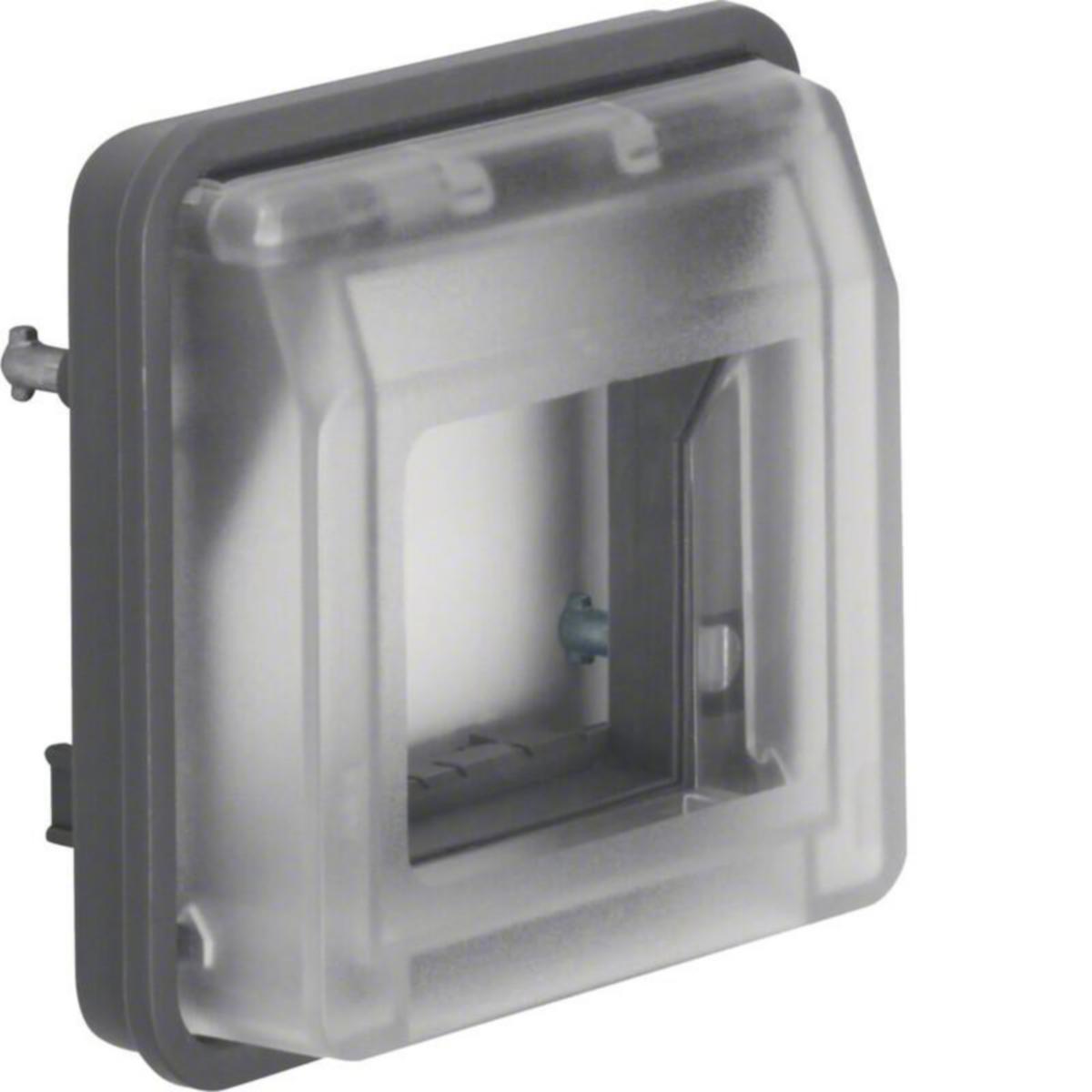 Adapterikansi Beker W.1 läpinäkyvällä suojakannella 45x45 kojeille – systo-kalustesarjan data- ja multimedialiitynnöille. Käyttö pintakojerasioiden tai uppoasennuskehyten kanssa.