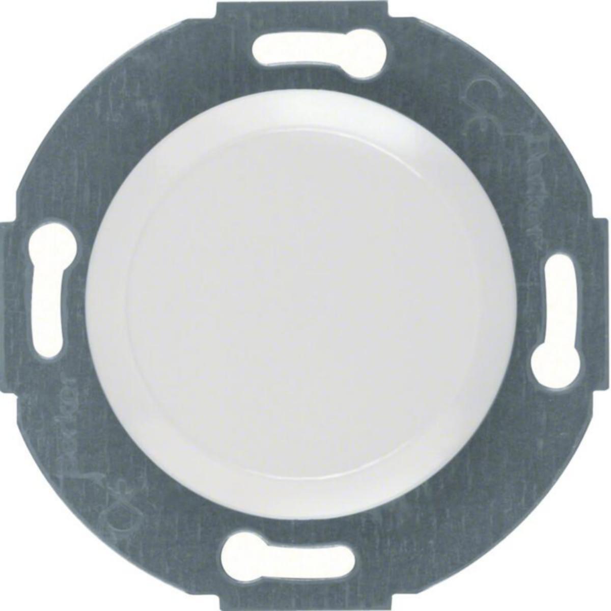 Umpikeskiölevy Serie 1930/Glass pyöreäksi leikatulla, metallisella asennuslevyllä kojerasian peittämiseksi "sokealla" kansiosalla. Keskiölevyn kiinnitys asennuslevyyn pikakiinnitysjousilla. Väri puhtaanvalkoinen kiiltävä.