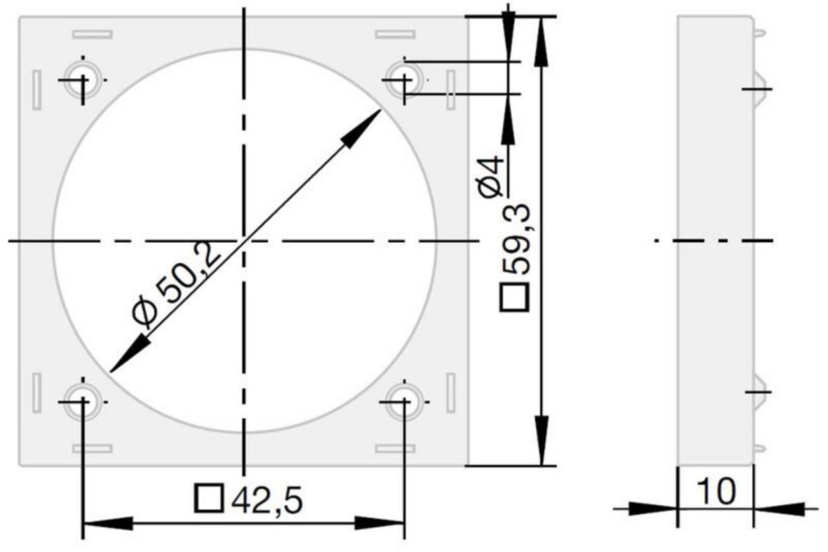 Korotuskehys paneeli- tai kalustepintaan 4-pistekiinnitettävien Integro Flow -kytkinten ja painikkeiden rakenteen sisälle menevän asennussyvyyden vähentämiseksi. Mitat (L x K x S): 59,5 x 59,5 x 10 mm Materiaali: thermoplast muovi