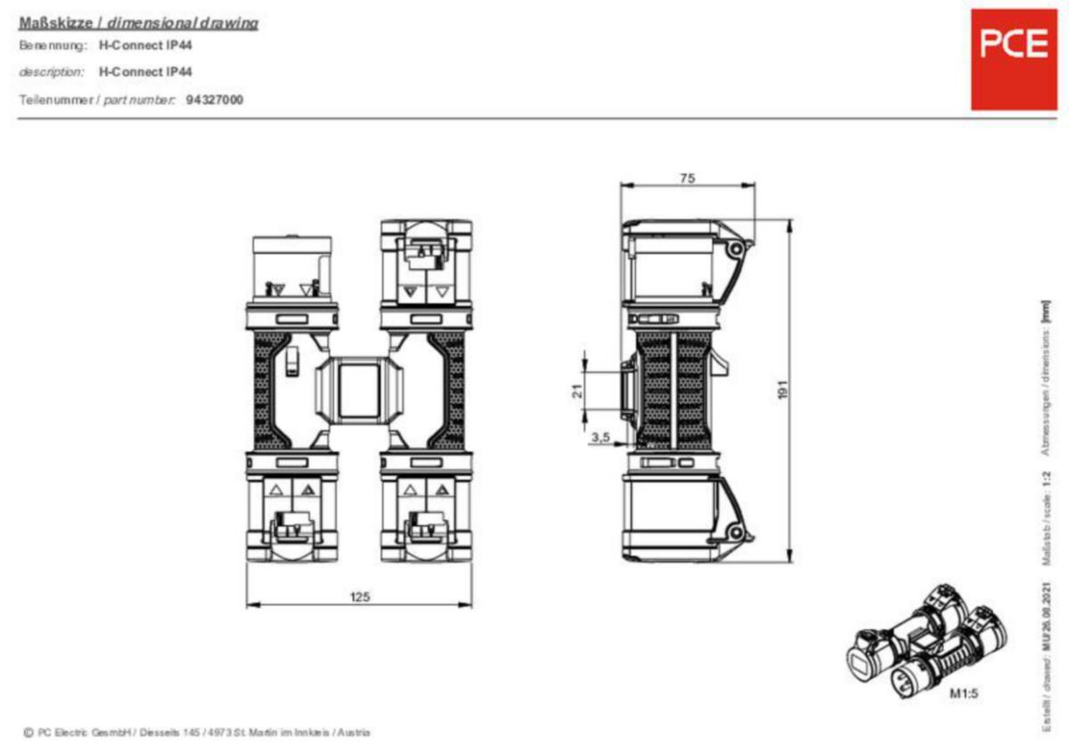 PCE 9432700 H-Connect Haaroitin 16A 3N 230V IP44 musta in: 3X16A out:3x 3X16A