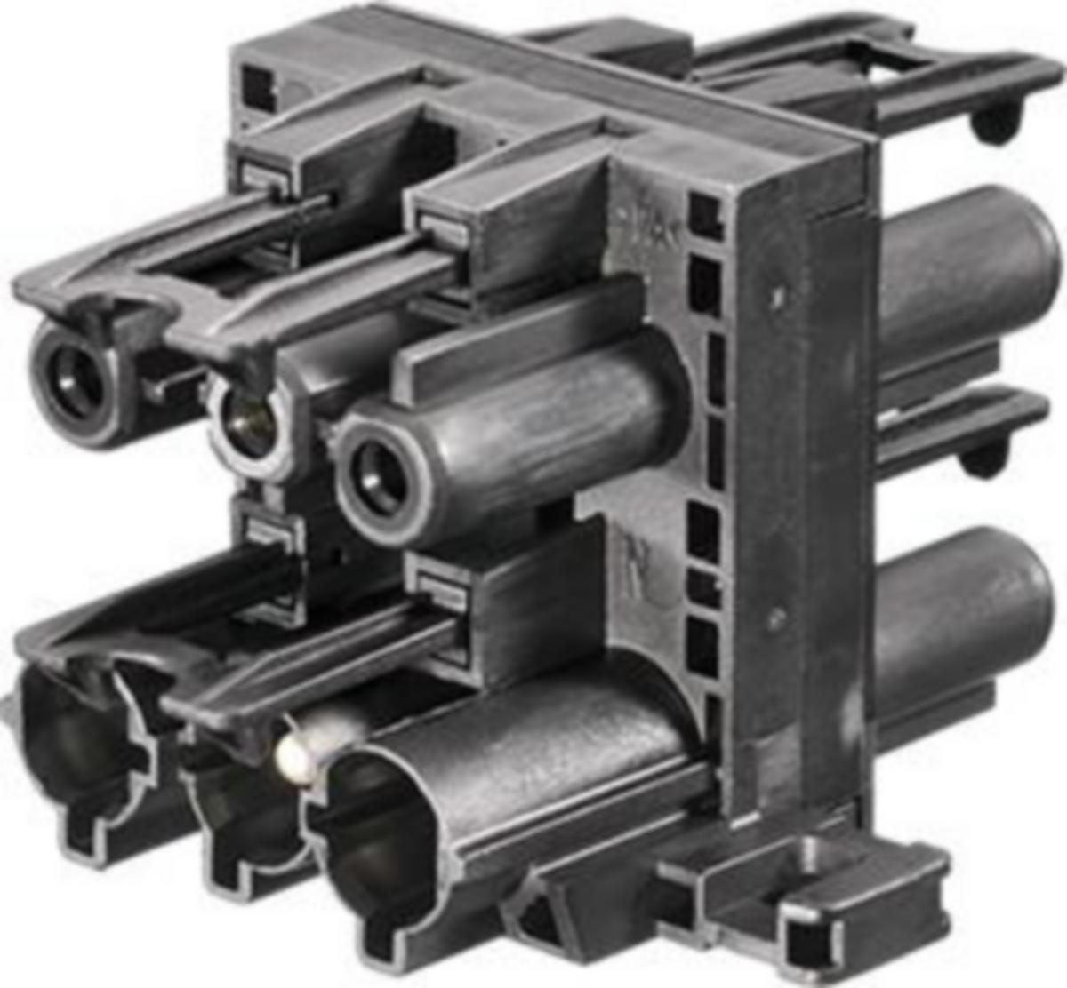 Wieland- haaroitin kappale, 1 x input (virtajohdolle) ja 3 x output laitteiden syöttöjohdoille. Haaroittimella voidaan ketjuttaa kolmen Wieland-liitäntäisen laitteen sähköt yhdellä virtajohdolla.