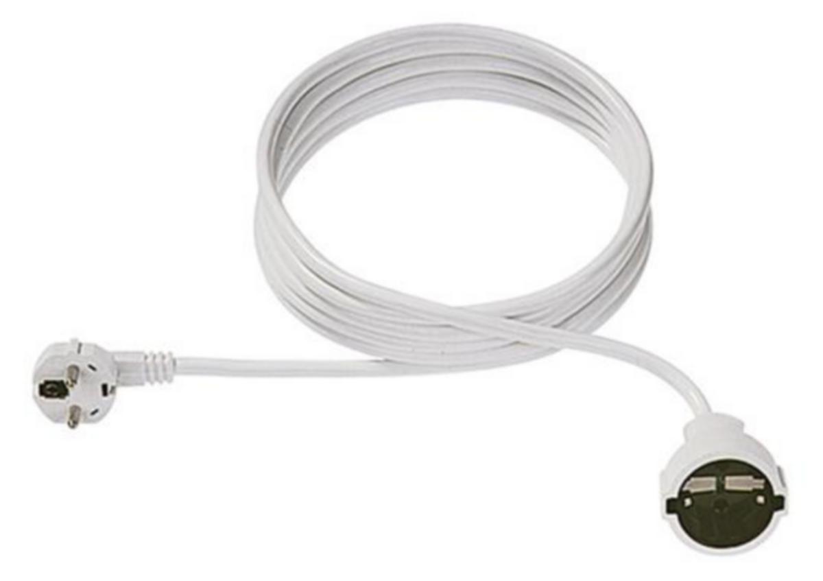 1-osainen valkoinen jatkojohto, pituus 15 metriä. H05VV-F 3G1,50mm². 16A/250V. Lämpötila-alue 70°C saakka. Toisessa päässä kulmapistoke (uros), jossa on kaksinkertainen maadoituskontaktijärjestelmä, valettu. Toisessa päässä maadoituskoskettimella varustettu kytkentäliitin (naaras), valettu. IP20. Materiaali PVC.