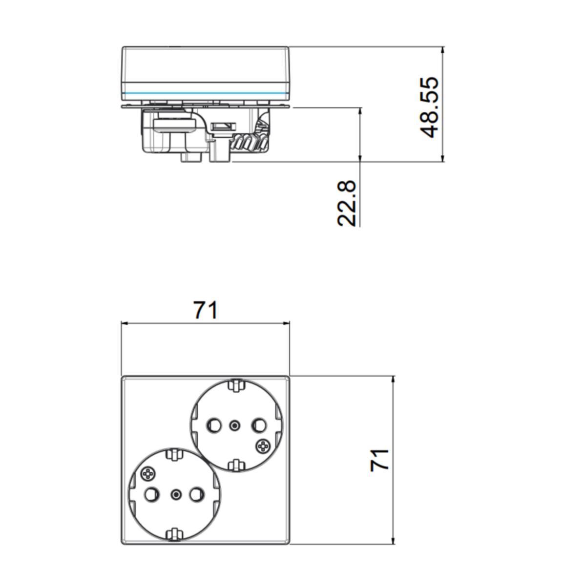 Kaksiosainen keskiölevyllinen schuko-pistorasia 16AX/250V. Jousiliittimet max. 2x2,5 mm²:n johtimille. Tuotteet asennettavissa Ensto Intron 85mm:n peitelevysarjaan.