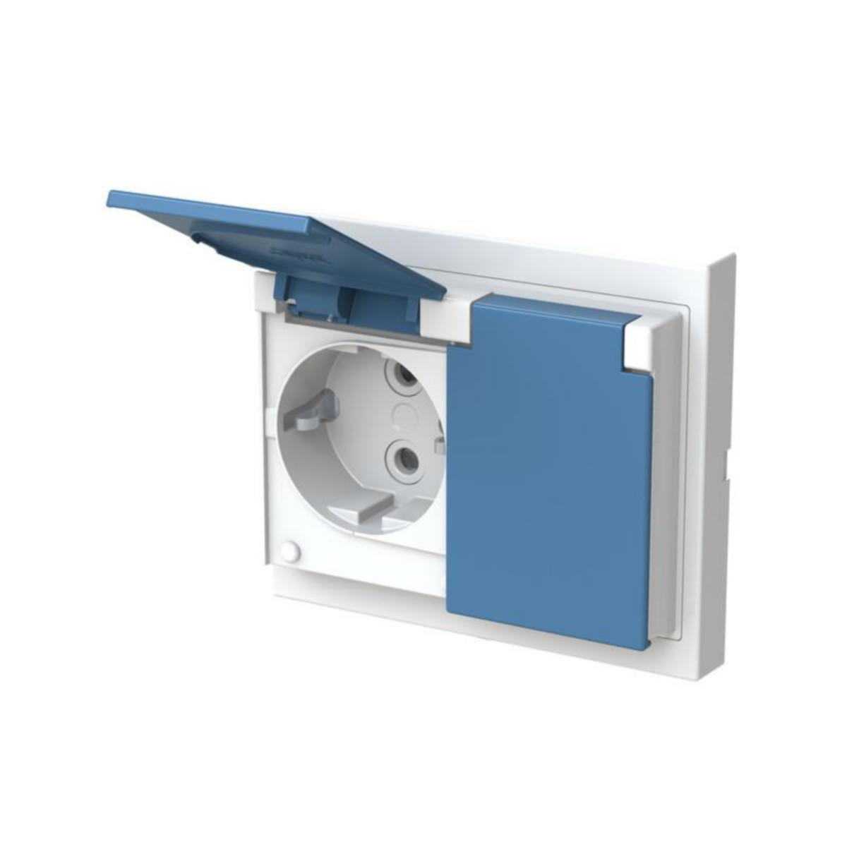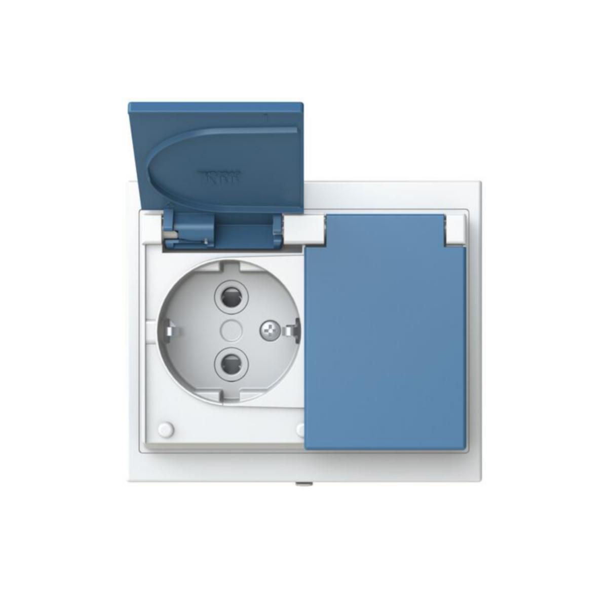 Uppoasennettava roiskevesitiivis pistorasia sinisillä läpillä. Pistorasiassa on liittimet kutakin kosketinta kohden ja niihin voi kytkeä max 4 johtoa (haaroitusmahdollisuus). Liittimet on hyväksytty ML ja MK johtimille. Ei potentiaalivapaita liittimiä. Pistorasian runko on kosketussuojainen ilman peitelevyä. Läppäkansi on varustettu jousimekanismilla.