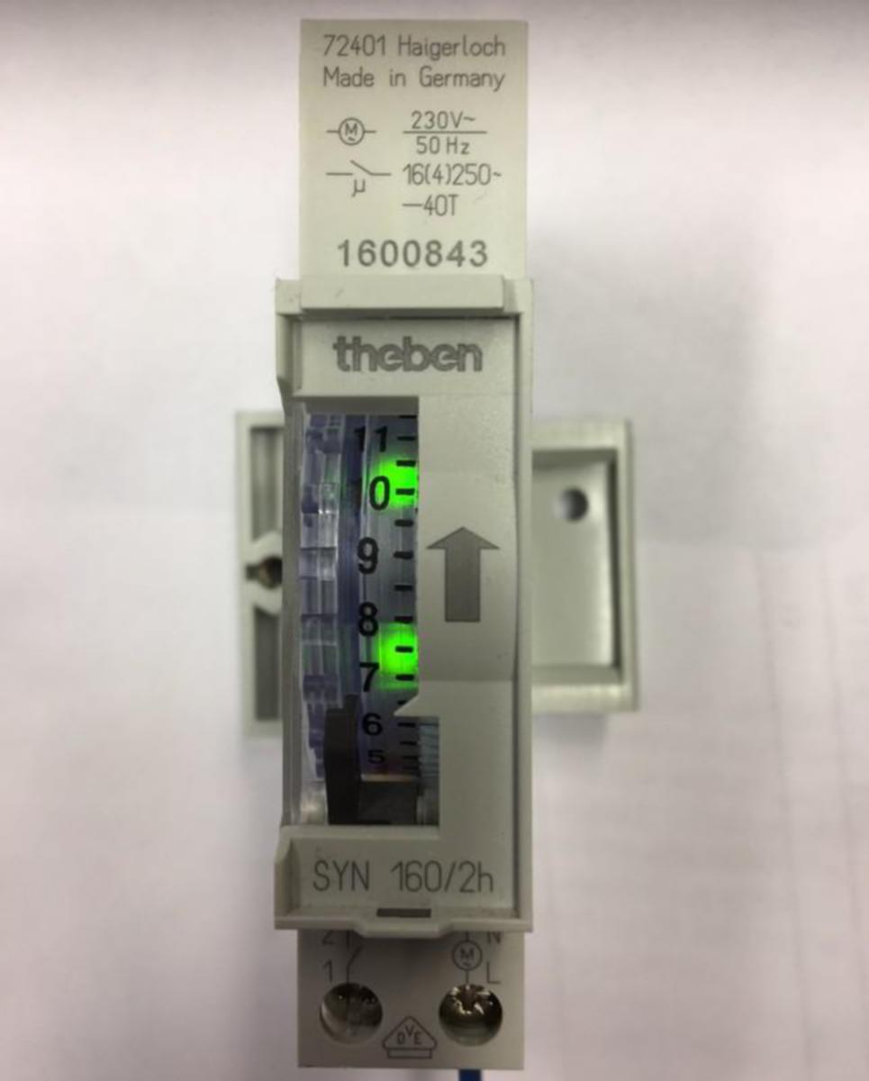 Autolämmityskellokytkin 2-tunnin kiinteällä kytkennällä, 1-moduli, DIN-kiskokiinnitys, taustavalolla.Pakkaskesto -40 C