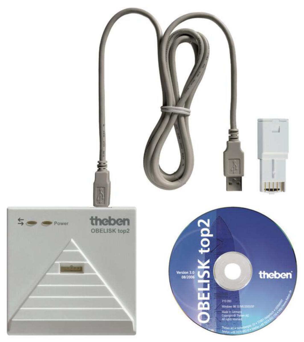 Kytkentäohjelmat, jotka on laadittu tietokoneella mukavan OBELISK top2-ohjelman avulla, voidaan siirtää USB-liitännän kautta OBELISK top2-muistikortille ja sieltä kelloon ja päinvastoin. Näin työmaalla ei tarvita tietokonetta tai kannettavaa tietokonetta. Ohjelmoinnin ja ohjelmalistauksen voi tehdä mukavasti työpöydän ääressä, Käyttöjärjestelmälle XP/Vista/7/8 (32/64 tavua), Sisältö: OBELISK top2-muistikortti, USB-sovitin, ohjelma, OBELISK top2 -ohjelman päivitykset saa maksutta osoitteesta www.theben.de