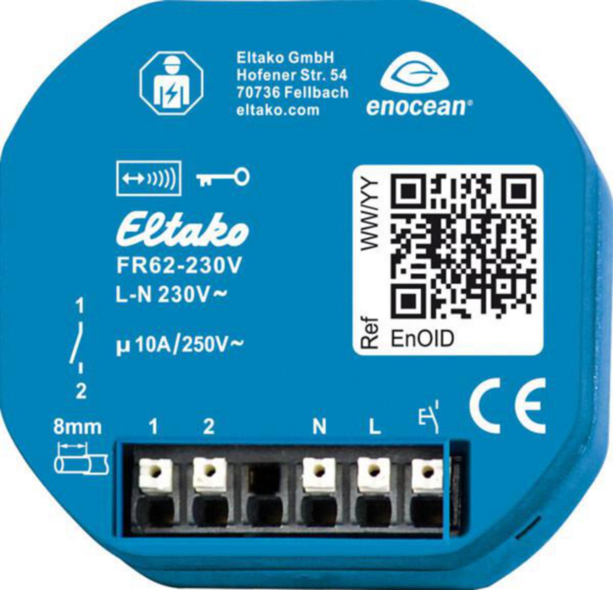 Langaton työvirtarele kojerasiaan. Rele vetää/päästää niin pitkään kuin painiketta painetaan. Yhteen releeseen voidaan opettaa yhteensä 32 eri langatonta painiketta, kaukosäädintä tai ovi-/ikkunakosketinta. Yhdellä langattomalla painikkeella voi puolestaan ohjata lukematonta määrää eri releitä. Releessä on myös johdollisen painikkeen tulo, jolloin langattomalla painikkeella ohjauksen lisäksi, tätä langatonta relettä voidaan ohjata myös millä tahansa perinteisellä johdotetulla jousipalautteisella 230V painikkeella.