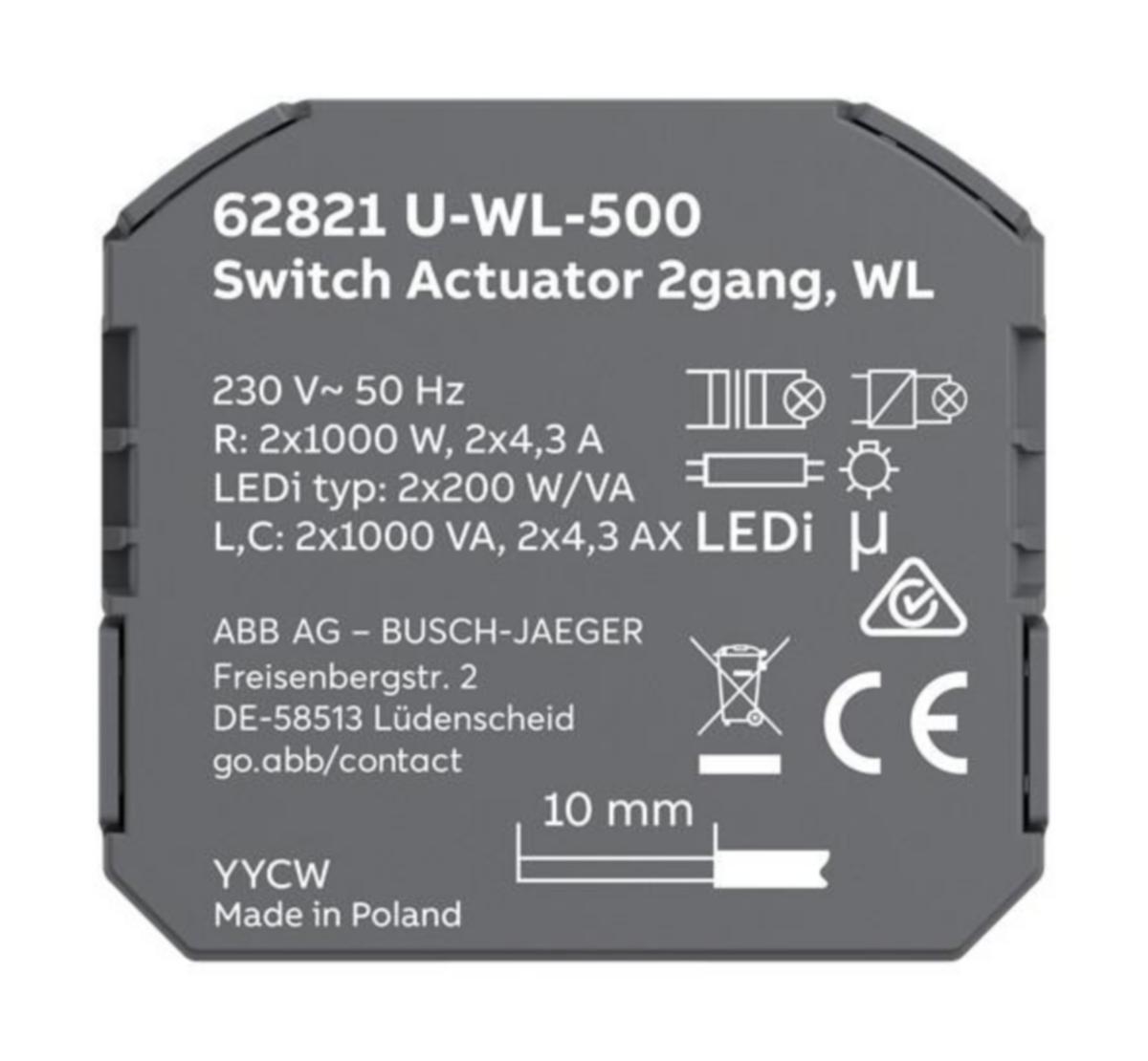 Releyksikkö 2-kanavaa 230 VAC valaistuksen ohjaukseen. Monipuolinen ratkaisu valaistusjärjestelmien ohjaukseen. Sopii sekä yksittäisten laitteiden hallintaan (laiteohjaus), että laajempaan verkottamiseen (huoneohjaus enintään 32 laitetta) ja voidaan liittää ABB-free@home-järjestelmään (kodinohjaus).3-johdin (230 V) kytkentä (nollajohdin vaaditaan)Pikaliittimet2kpl NO-kärki, ei potentiaalivapaaLiitäntä mahdollisuus 230V kytkimelle tai painikkeelleKojerasia asennus (mahtuu kytkimen taakse)Kuorma 230V: LEDi 300VA, hehku- tai halogeenilamput 2300W ja loistelamput 3000WSisäänrakennettu bluetooth-yhteys (laite- ja huoneohjaukseen mobiilaitteella max. 32 laitetta). Bluetooth-yhteydellä parametrien asetukset ABB-free@home NEXT-sovelluksessaLiitettävissä ABB-free@home-järjestelmään (2,4GHz). Liitettynä ABB-free@home-järjestelmään parametrien asetukset käyttöliittymässä