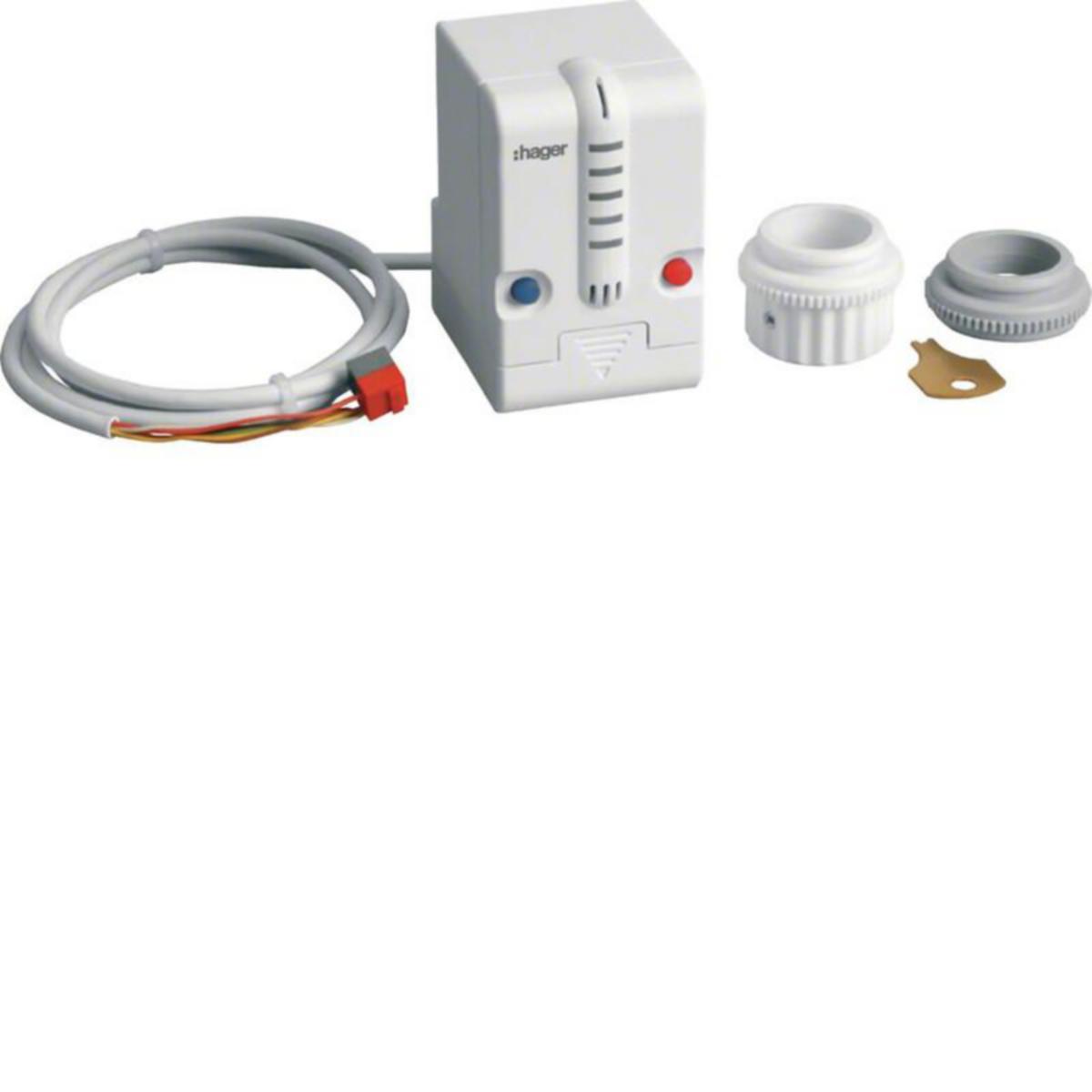 KNX-venttiiliohjain termostaatillaKäyttöjännite väylän yli 21 ... 32 VDC Käyttölämpötila +0 ... +50 °C Esiasennettu kaapeli n.; 1 m Mitat (K x L x S) 65 x 50 x 82 mmMukana löytyy kaksi venttiiliadapteria, soveltuen: Danfoss RA, Heimeier, MNG, lukot alkaen 03/93, Honeywell, Braukmann, Dumser (jakelija), Reich (jakelija), Lan dis + Gyr, Oventrop, Herb, Onda− soveltuu vakiolämmittimien venttiiliohjaimille − ohjelmointipainikkeella ja punaisella ohjelmointi- LEDillä − kesäkäyttö − 2:lla itsenäisellä binääritulolla − 5:llä LEDillä venttiiliasennon näyttöön − integroidulla väyläkytkentäyksiköllä − väyläliityntä kytkentäliittimellä − lämmitys- tai jäähdytystilalle − käyttötilat: mukavuus, valmiustila, yöpudotus, jää tymis/lämpösuojattu − esiasennettu, kaapelilla