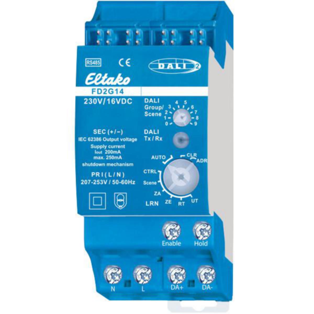 RS485-väylän DALI2 väylämuunnin (gateway).DALI-2 sertifioitu. DALI-2 on DALI-standardin uusin sukupolvi, jossa on laajempi valikoima erilaisia toimintoja. DALI-2-laitteet sisältävät myös kaikki aiemmat DALI-toiminnot ja ovat siksi yhteensopivia myös vanhempien laitteiden kanssa.Modulaarinen yksikkö kiskoasennukseen normin DIN-EN 60715 TH35 mukaisesti.2 moduulia = leveys 36mm, syvyys 58mm.Liitäntä Eltakon RS485 väylään. Väylä ja virransyöttö kytketään jumppereilla. Käyttö vain yhdessä FAM14:n kanssa.Syöttöjännite 230V/50Hz liittimiin L ja N.DALI-laitteiden IEC 62386-mukainen jännite DA +/- -liittimissä.Lähtövirta 200mA/maks. 250mA.Päällekytkentäaika maks. 250ms.Oikosulun sattuessa virtalähde katkaisee syöttöjännitteen. Mekanismi syklisille päällekytkentäyrityksille on saatavilla.FD2G14-yhdyskäytävän avulla, DALI-laitteita voidaan ohjata langattomien EnOcean-laitteiden signaaleilla.Ryhmiä 0-15 voidaan ohjata ja broadcast komento on lähetettävissä.Lisäksi DALI-tilanteita/scenejä 0-15 voidaan ohjata.DALI-asennukset, joita ohjataan ainoastaan FD2G14:llä, on määritettävä ryhmiin 0-15.DALI-2-anturien arviointi voidaan konfiguroida ja aktivoida PCT14-ohjelmann avulla. DALI-2-tapahtumavies-tit voidaan tulkita ja lähettää ulos RS485-väylään laitteen Hold-liittimen avulla. Tämä mahdollistaa tietojen lähettämisen ulos langattomaan Enocean-radiotaajuus verkkoon FTD14:n avulla. FD2G14 varaa 16kpl 14-sarjan laiteosoitetta. Laiteosoitteiden viestit vastaavat himmennysarvoja (dimming value) DALI ryhmissä 0-15, nousevassa järjestyksessä. Tilatiedot voidaan lukea PCT14 ohjelmistolla jokaisessa yksittäisessä ryhmässä kuten himmenysarvo (%) ja painikeviestit (ON/OFF). Tilatiedot voi sitten ohjata 14-sarjan toimilaitteita. FD2G14 laite toimii Masterina sekä sisältää DALI-väylän virransyötön. Kiertokytkimellä voidaan ainoastaan opettaa painikkeet ryhmiin 0-8 ja DALI tilanteet/scenes 0-9. Aktivointiviestit ryhmistä 9-15 ja tilanteista 10-15 on mahdollista tehdä vain PCT14 ohjelmistolla. Tuotantoviikosta 30/19 alkaen, FD2G14:ta voidaan käyttää yksikanavaisena laitteena 'FD2G14-Broadcast'. Tämä määritetään, kun laiteosoite annetaan. Tärkeää: Langattomia painikkeita on aina tuplaklikattava, kun niitä opetetaan manuaalisesti FD2G14:ssa. CLR (poistotoiminto) tarvitsee vain yhden painalluksen. Suuntapainike tai yleispainike, jolla on sama ID-tunnus, voidaan opettaa useaan kertaan eri ryhmille. Viimeksi valittu ryhmä on aina voimassa, siksi painike voi kytkeä ainoastaan yhden ryhmän tai viestin "broadcast" kaikille ryhmille. Yksi FBH per ryhmä voidaan myös opettaa. Manuaalisella opetuksella tämä toimii aina kirkkaudesta riippuen. PCT14:n avulla voit myös asettaa kirkkauden kynnyksen. Sammutusviive, kun liikettä ei havaita, voidaan asettaa yhdessä minuutteina (1...60) kaikkien ryhmien FBH-laitteille. Oletusarvo on 3 minuuttia.