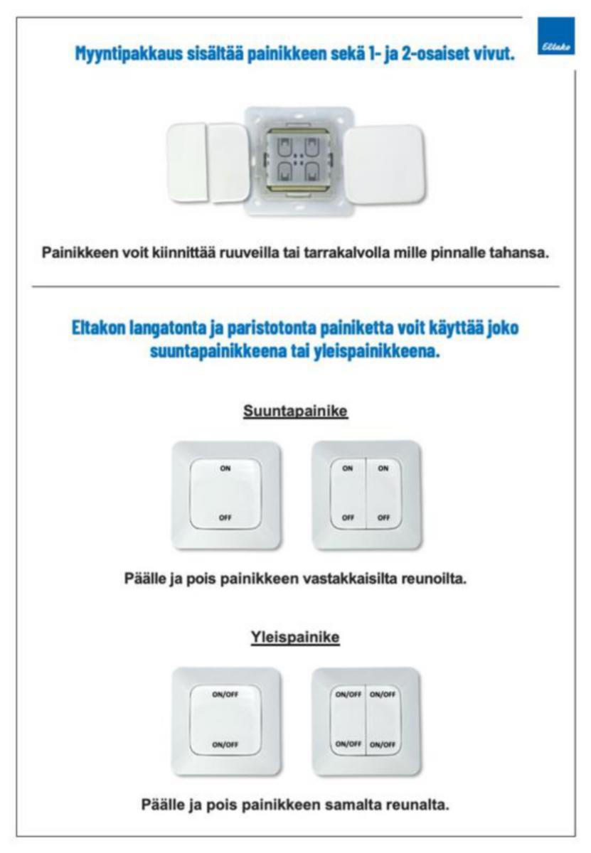 Langaton ja paristoton painike, ABB Jussi kalustesarjaan, sisältää 1- ja 2-osaiset vivutLangattomat ja paristottomat painikkeet voit yhdistää mihin tahansa ELTAKOn langattomiin releisiin ja valonsäätimiin. Painikkeet voidaan opettaa toimimaan joko kytkimen tyylisesti (päälle/pois painikkeen vastakkaisilta puolilta) tai painikkeen tyylisesti (päälle/pois painikkeen samalta puolelta). Yhden painikkeen voi yhdistää myös useampaan vastaanottimeen kerralla.